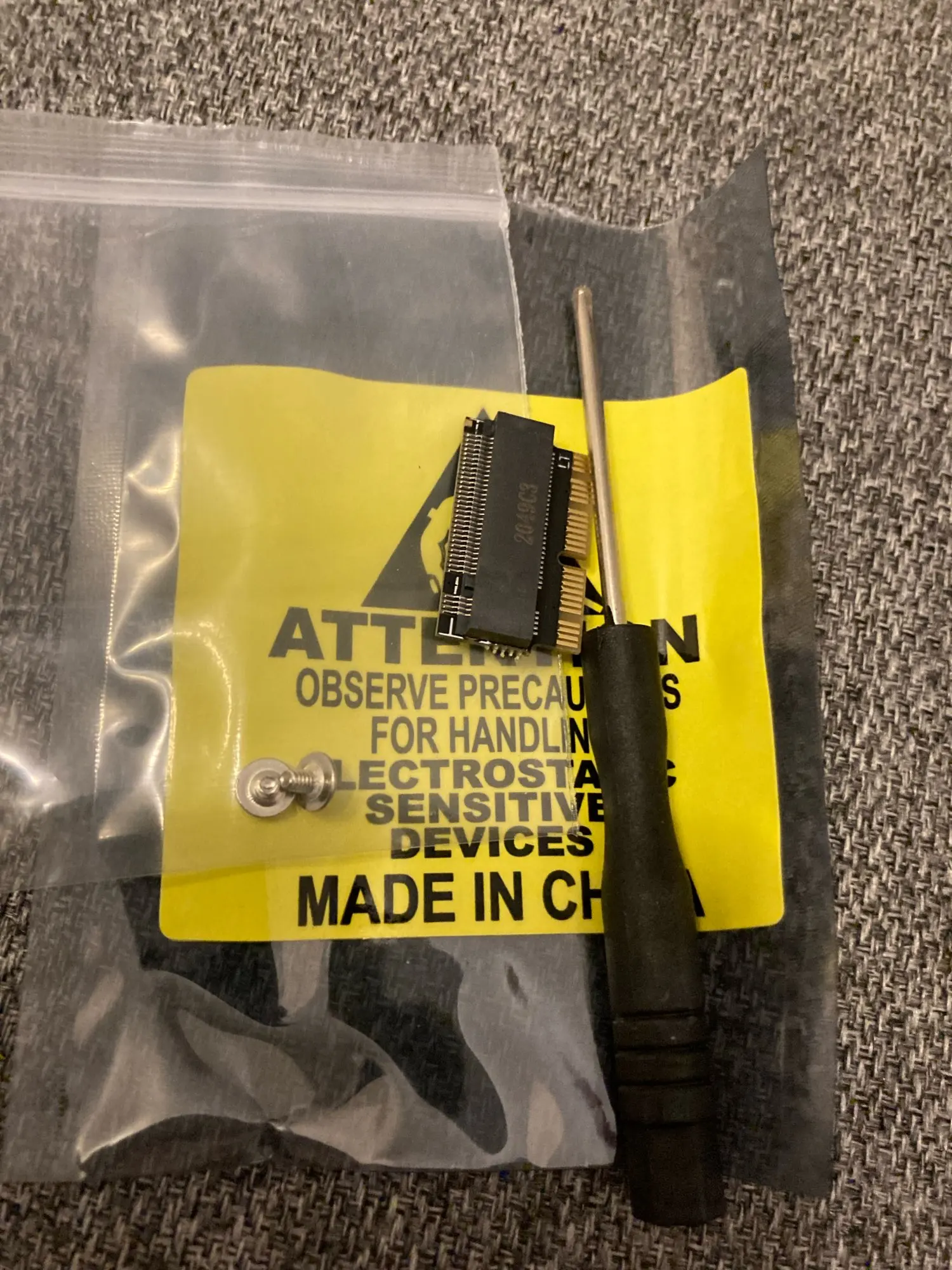 В пакете антистатике, с отверткой и двумя винтиками.