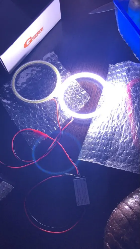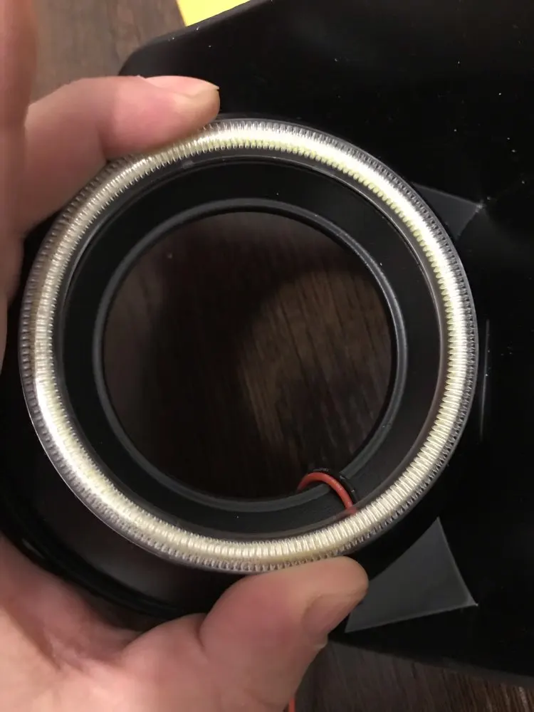 Доставка 14 дней. Качество отличное, свет равномерный без точек. Даже провода качественные. Колечко идеально встало на маску фары