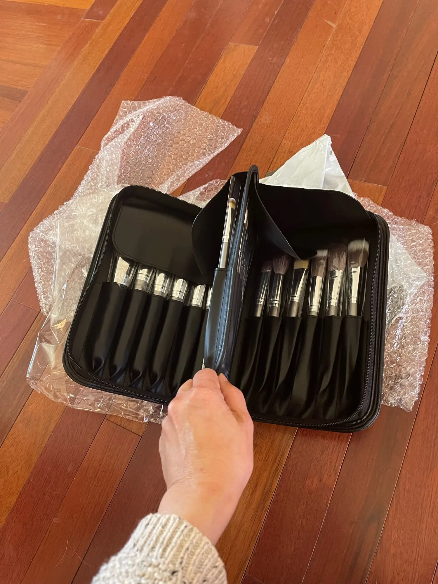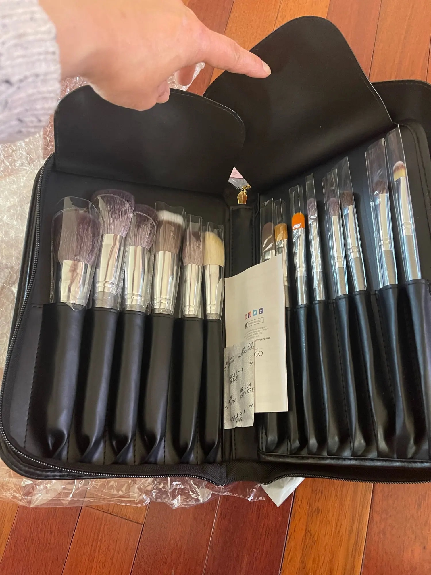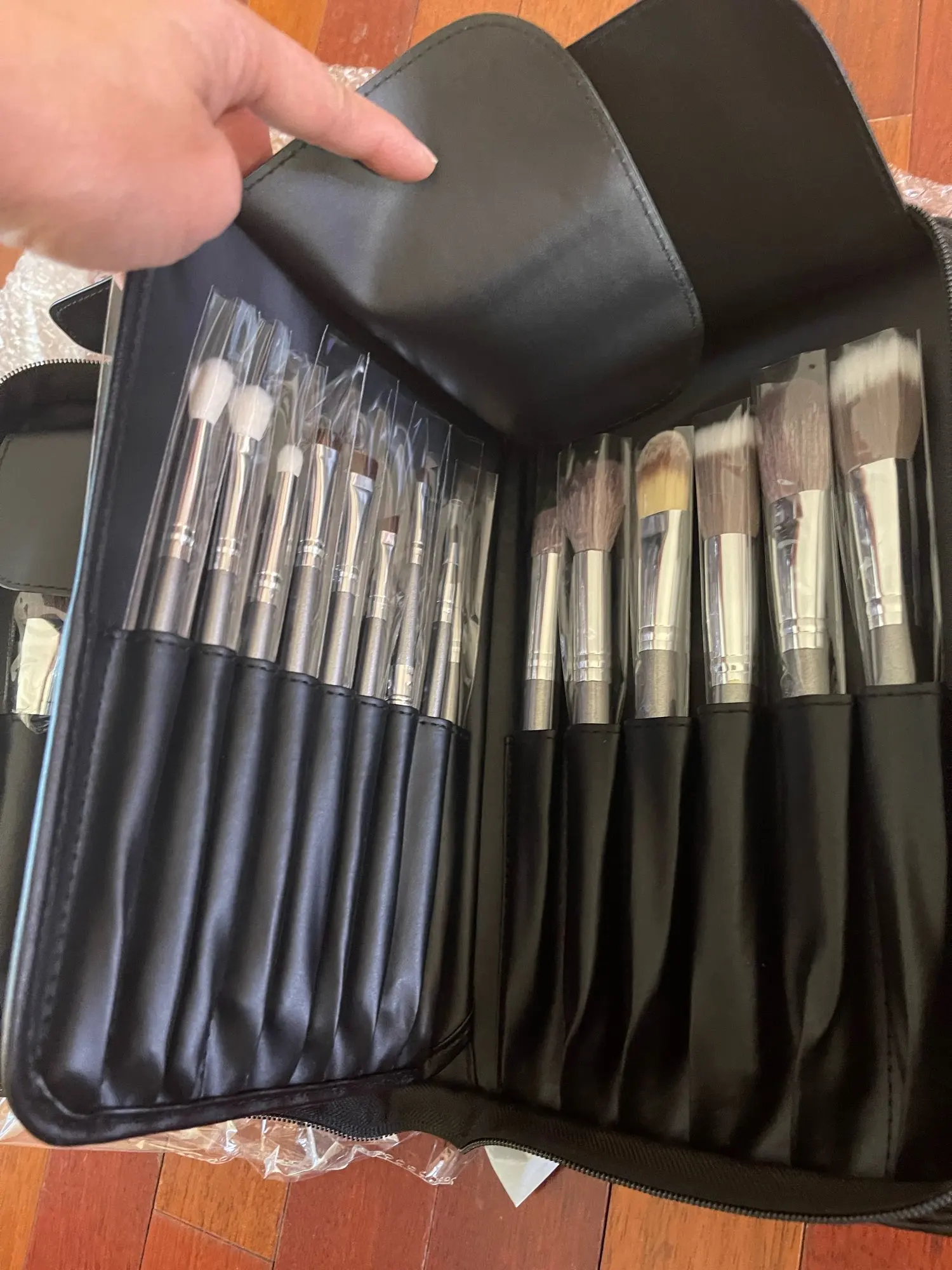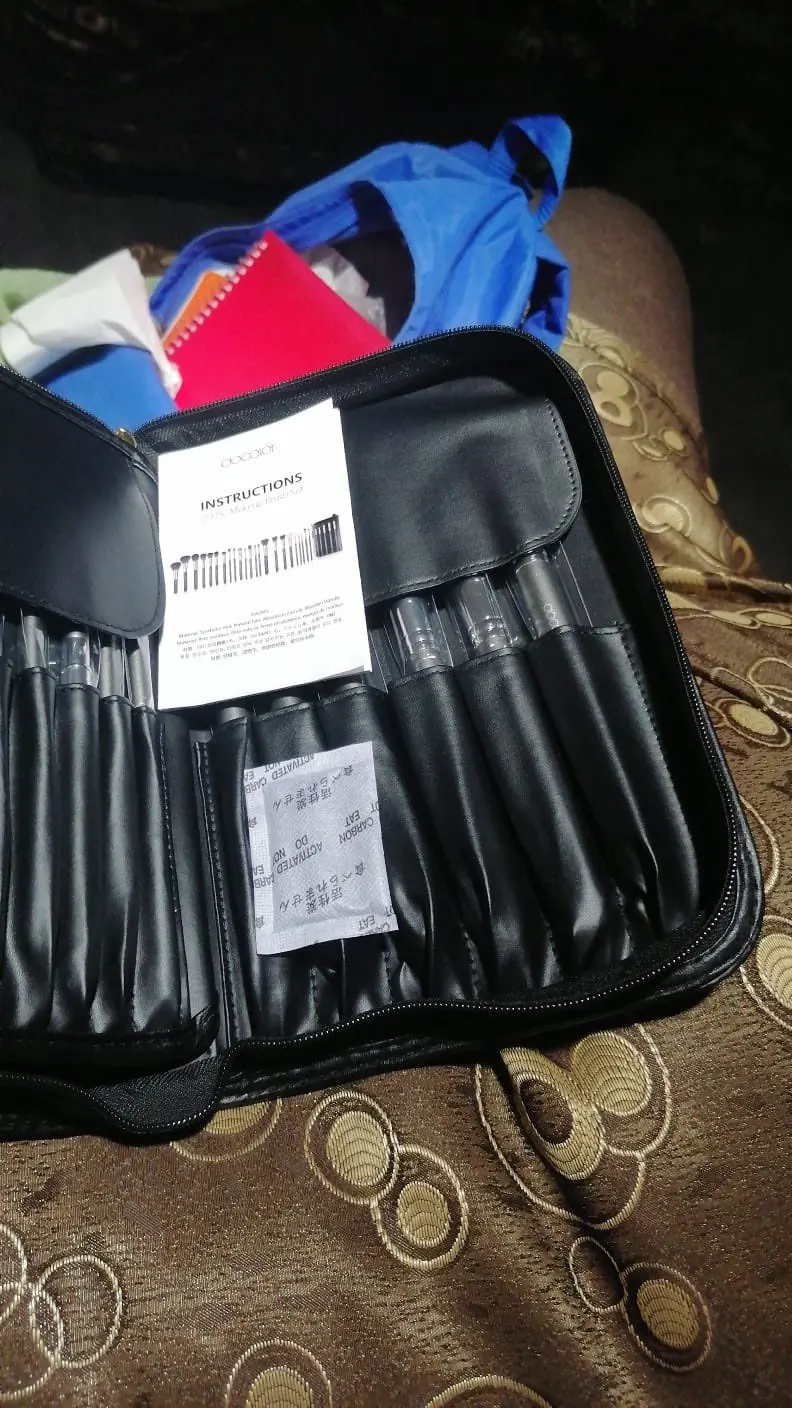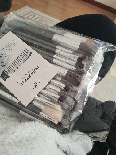 Очень крутые кисти, набитые, ворс на некоторых натуральный, на других искусственный. Коза очень мягкая. Есть 3 хороших кисти для бровей. Ручки удобные. Запаха нет вообще. Выглядят дорого.