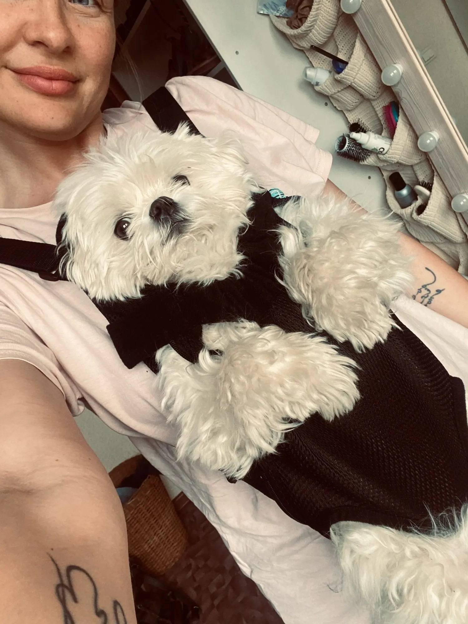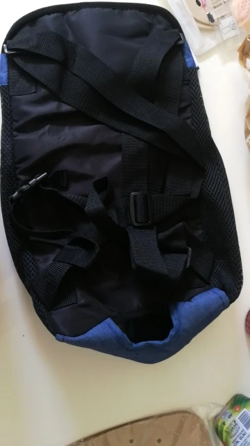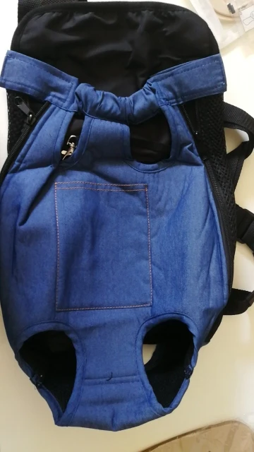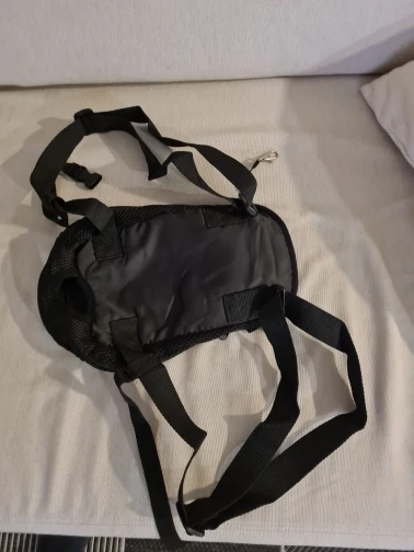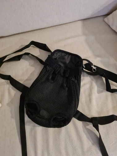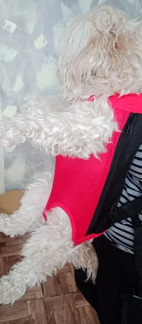 но на мою нестандартно маленькую йокширку надо впол,тора раза меньше ,чем S. Да еще проблема, что вперед ногами ей не хочется ,так что переворачиваю к себе лицом( мордочкой) ☹