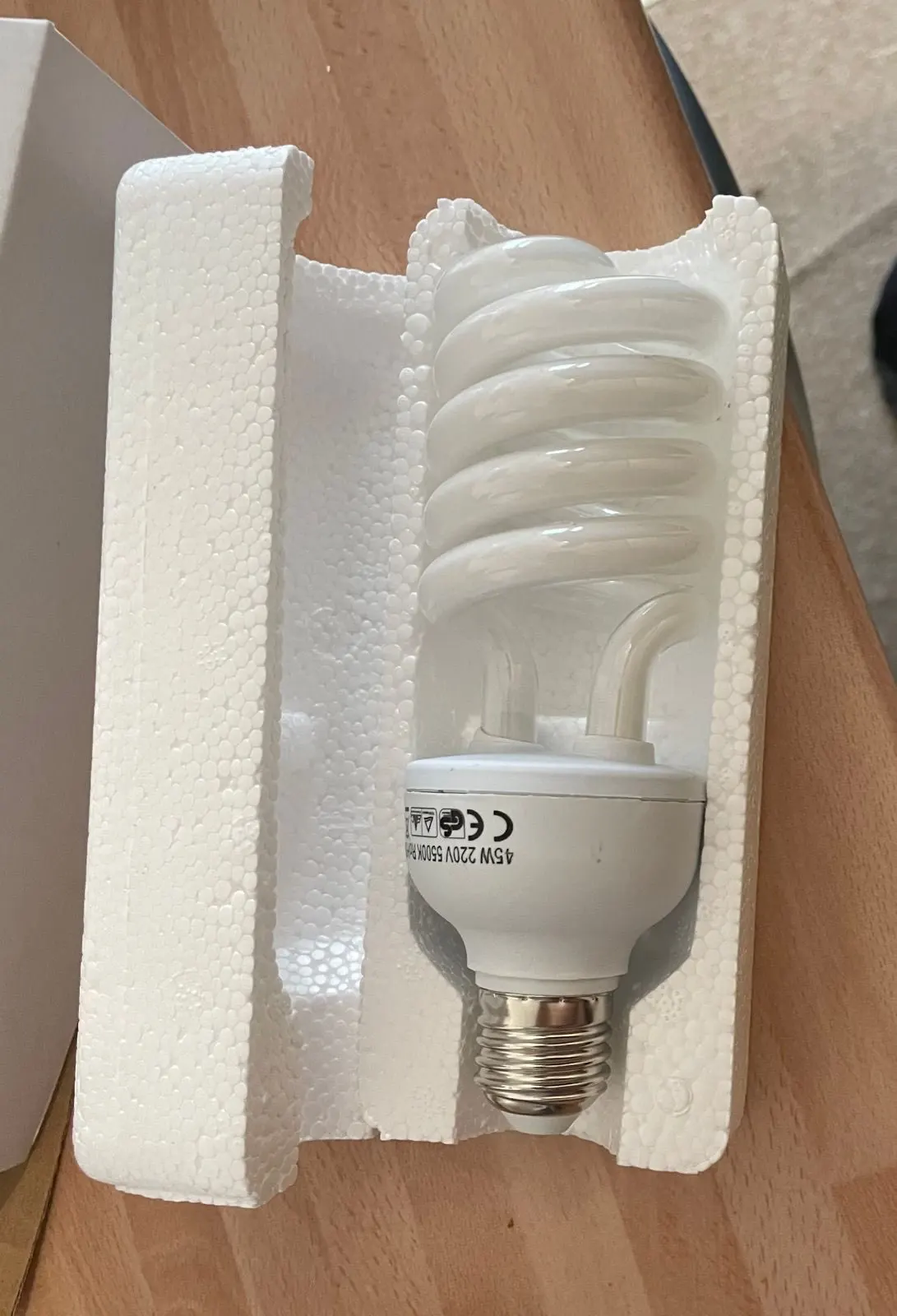 Лампы на вид качественные. 45 Вт светит не очень ярко, приблизительно как лампа накаливания на 100 Вт. Упаковка обычная заводская - пенопласт и картонная коробка.