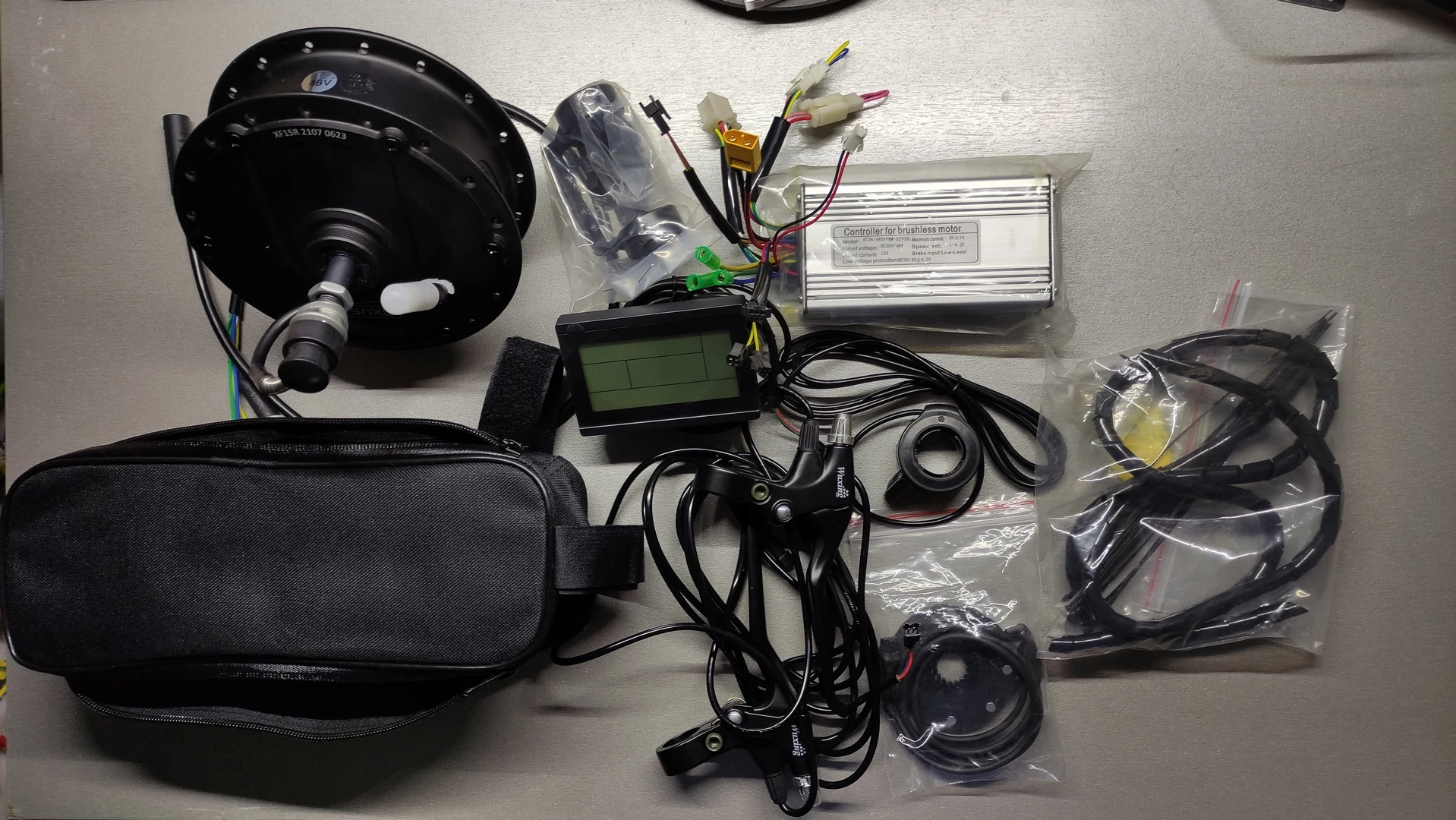 MXUS xf15r, lsd3, 26inch. Набором очень доволен. В комплекте были спицы G12, толщиной 2,6 мм, продавец правильно рассчитал длину спиц и положил в посылку 2 дополнительные запасные спицы, я самостоятельно заспицевал мотор-колесо в свой обод в 2 креста, отверстия в в алюминиевом ободе легко рассверлил домашней дрелью сверлом на 5 мм, lsd-3 позволяет программировать и настраивать множество функций, легко запрограммировал включение круиз-контроль и режим сопровождения пешехода, а также уменьшил мощности на Assistant 1,2,3 и 4. Ручкой газа пользуюсь редко, чаще использую режим PASS (помощь педалированию) при этом часто меняю значение ASSIST (мощность помощи) от 1 до 5, это зависит от крутизны подъемов и желаемой скорости. Хотел бы ещё заказать один вело набор, но, к сожалению, продавец исключил из набора спицы и поднял цену на доставку в Украину с 29 до 61$. До сих пор не могу понять, почему при скорости около 38-42 км/ч контроллер KT очень сильно уменьшает подачу тока на мотор.