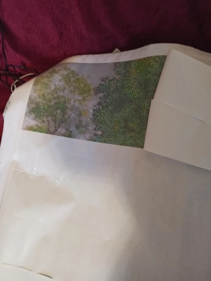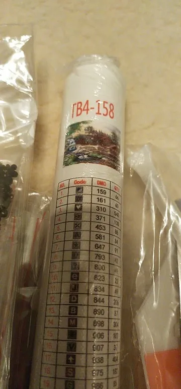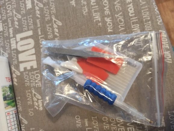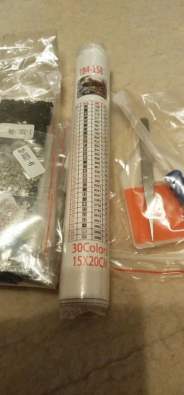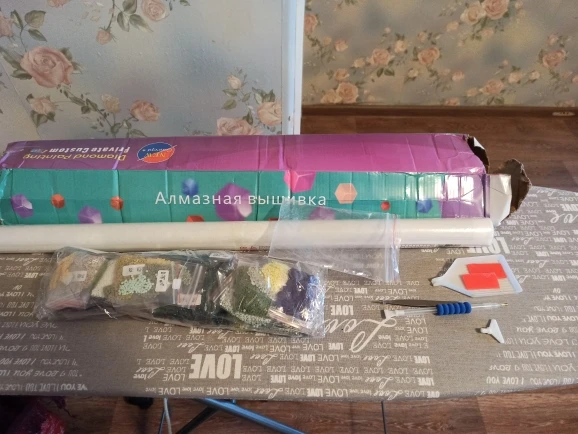 Пришло за 2,5 недели в Оренбургскую обл. С виду все цело и на месте. В комплекте подложка, палочка, клейкая штука и щипцы. Коробка изрядно потрепанная, но повреждений на самой картине нет.