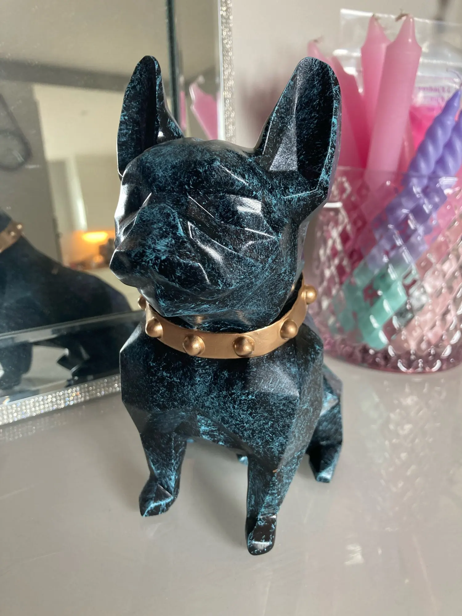 Пёс просто топчик! Невероятно стильный Я взяла синего, потому что в нем есть структура и попала в яблочко! Купила в подарок, а уже хочу оставить бульдога себе Доставка очень быстрая. Статуэтка упакована в толстенный пенопласт!
