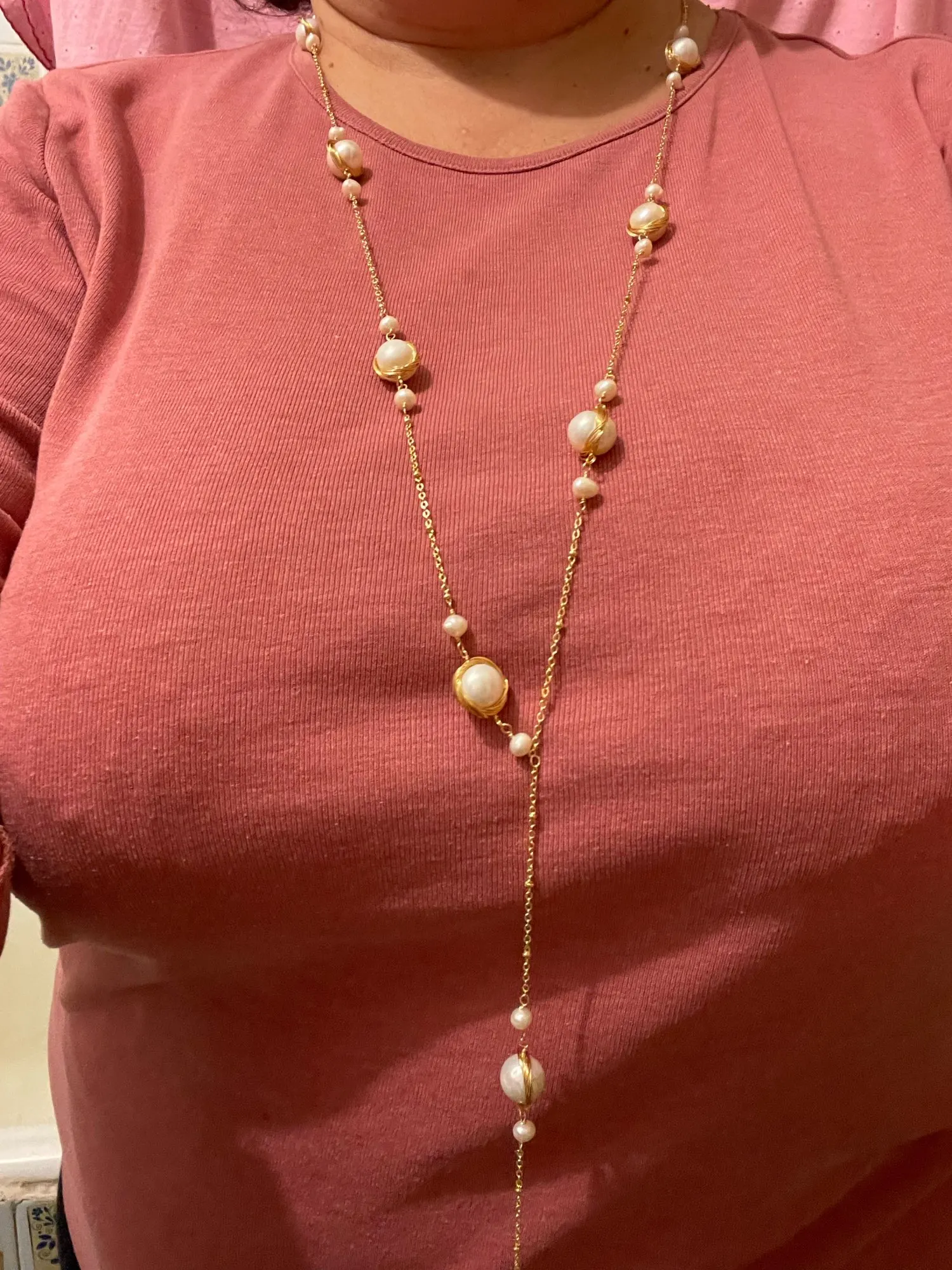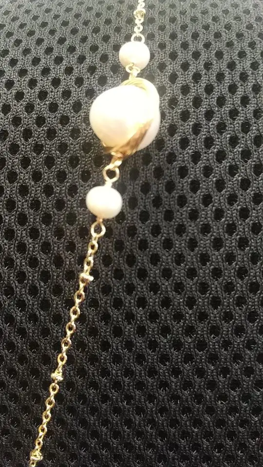 очень милое украшение. боялась, что витые детали будут цепляться за одежду. но нет, всё загнуто очень аккуратно, не цепляется. цвет цепочки ближе к цвету лимонного золота, чем розового, выглядит хорошо. пришло в весёленький коробочке, салфетку и пакетик продавец положил в подарок. Украшение длинное, на мой небольшой рост нижняя бусина на уровне талии.
