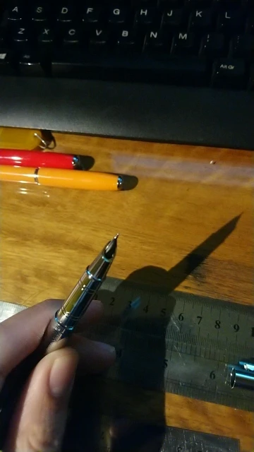 Ручка хорошего качества, металлическая, увесистая, очень симпатичная. Но толщина линии не 0.38 мм, как было заявлено. Перед этим покупал пластиковую ручку Jinhao (аналог Lamy safari) с пером EF. Так вот толщина линии такая же, а расход чернил даже побольше. Потому ,если бумага не очень высокого качества, линии слегка расплываются. Посылка дошла очень быстро, в целости. Рекомендую этого продавца.