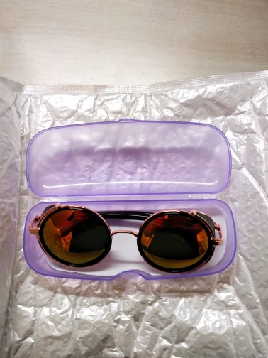 очки пришли за месяц в калугу. упакованы в две обертки и пупырку. сами очки в футляре, но он маловат, очки гнуться в нем чуть. очки из метала, линзы стекла вроде как, тяжелые сами по себе. на мне кажуться большими, или у сеня башка маловата. а так все отлично, смело заказывайте