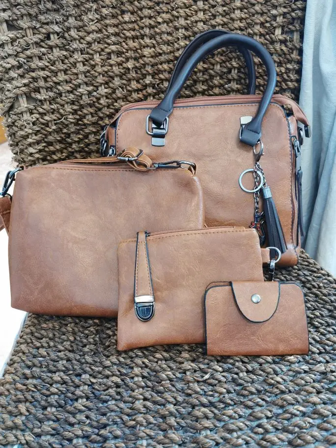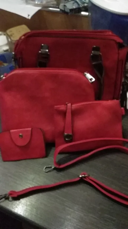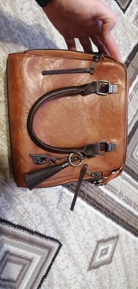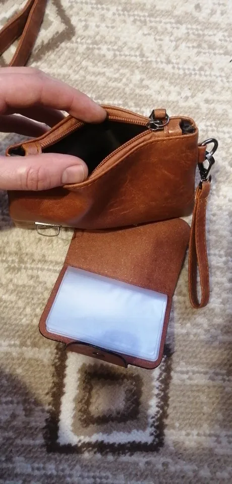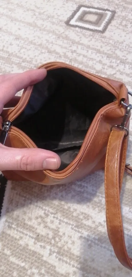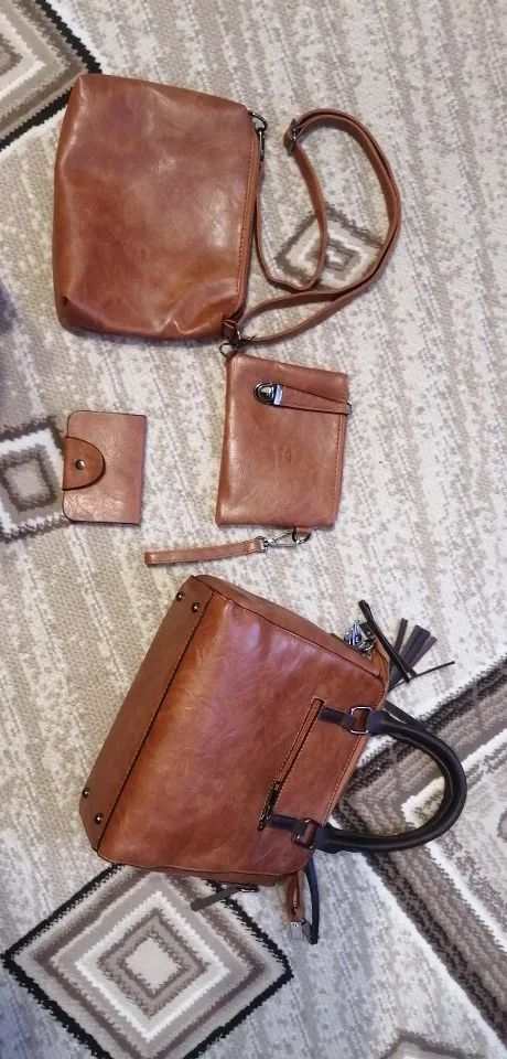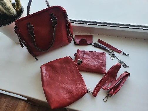 Хороший набор, сумочка, визитница, ручной клатч и типа кошелёк))) Всё швы прошиты очень хорошо, нитки не торчат, все молнии работают. Запаха практически нет. В сумочке два отдела, я которые разделяет карман на замке, так же есть ещё один кармашек на замке. Снаружи сумки, на одной стороне так же есть карман на щамке, есть ещё два фальш-замка, но карманов ща ними нет. В клатче(маленькой сумочке) один кармашек на замке, в кошельке так же один карман тоже на замке, который ещё и пристегивается на заклёпку. Визитница маленькая, всего на 6 карт. В общем товаром довольны. Ещё продавец в подарок положил прикольную рещиночку для волос)) мелочь, а приятно)))