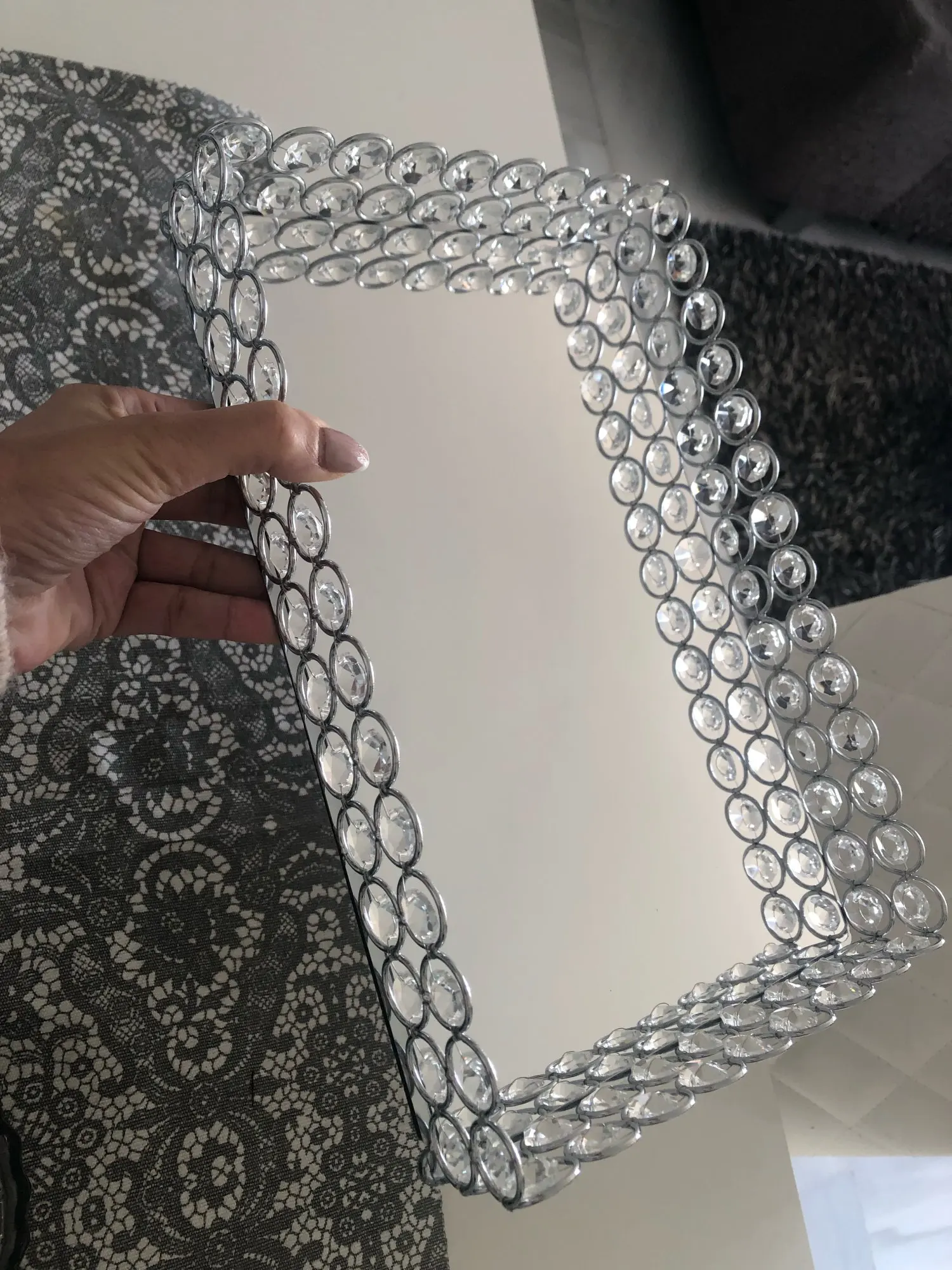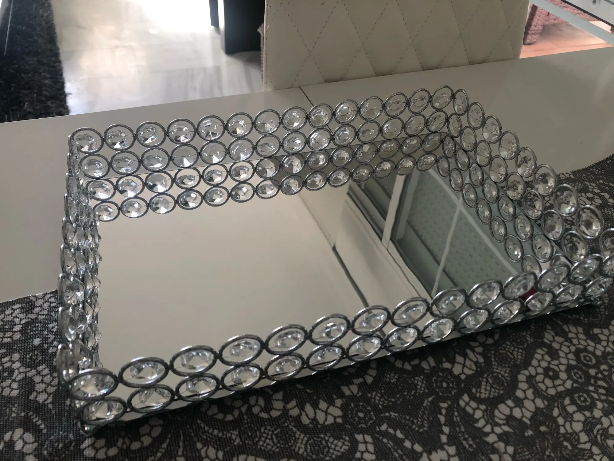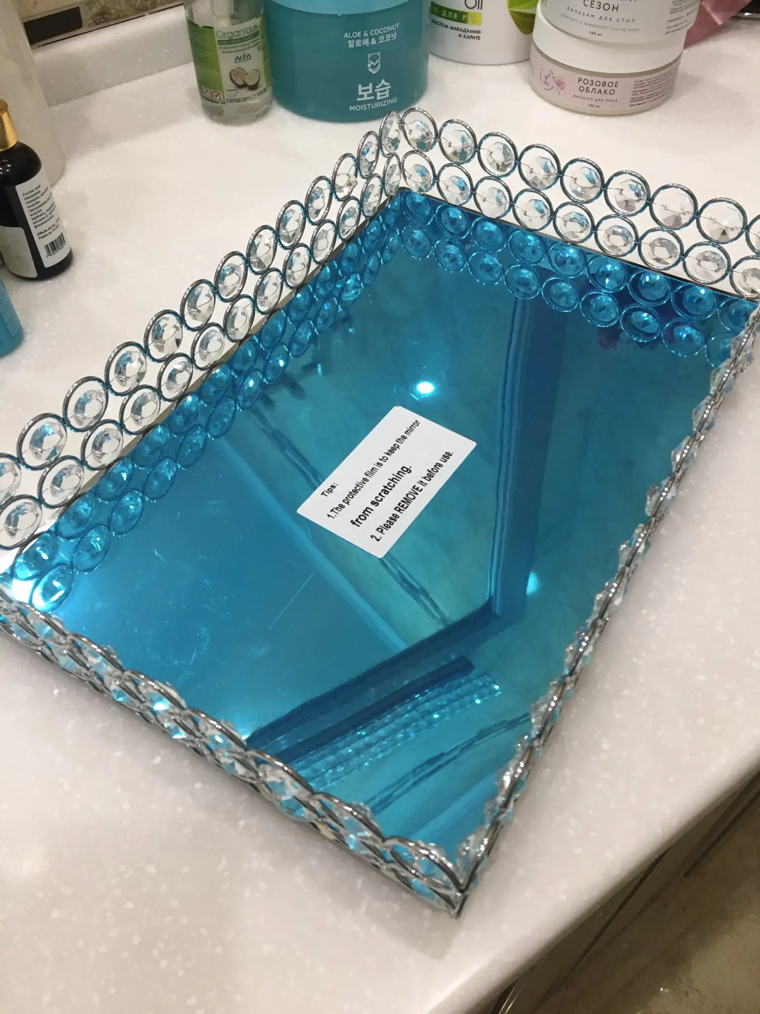 Симпатичный поднос, соответствует описанию продавца, правда зеркальное дно подноса выглядит как будто слегка поцарапанным, с разводами, на фото этого не видно.