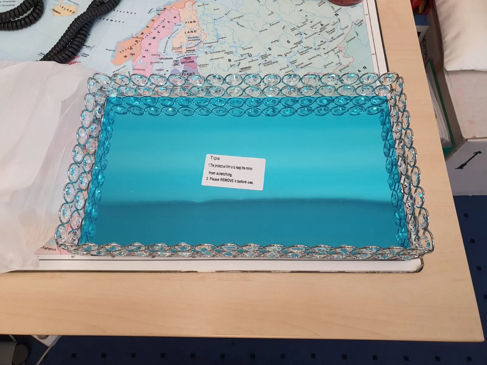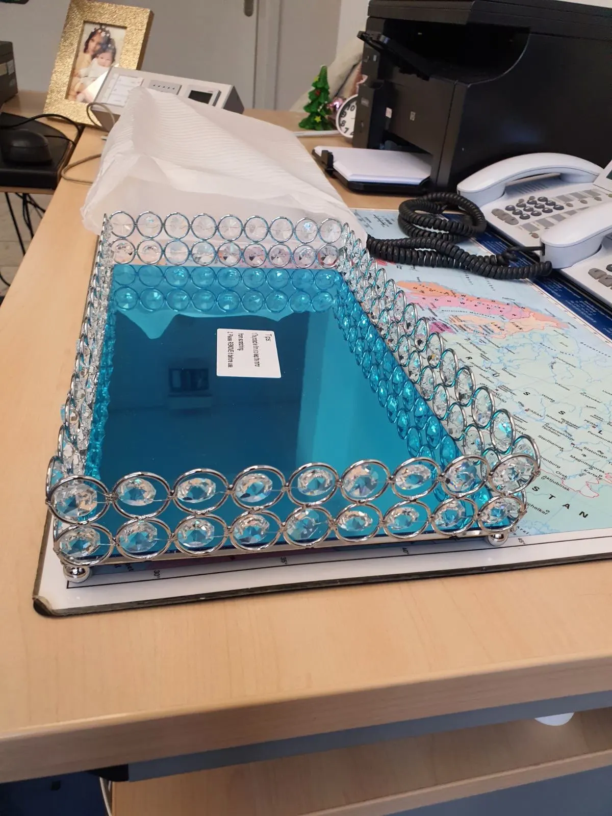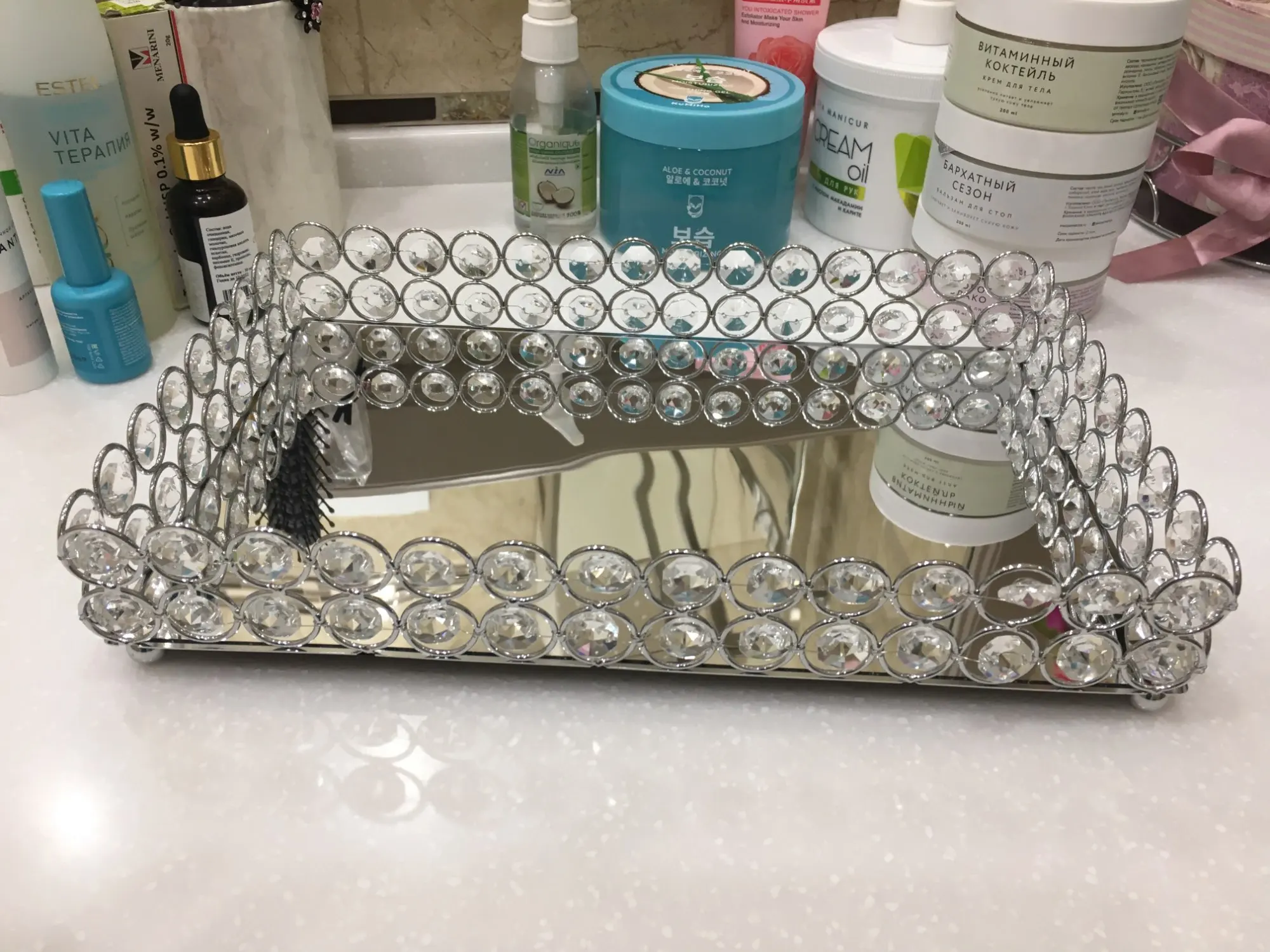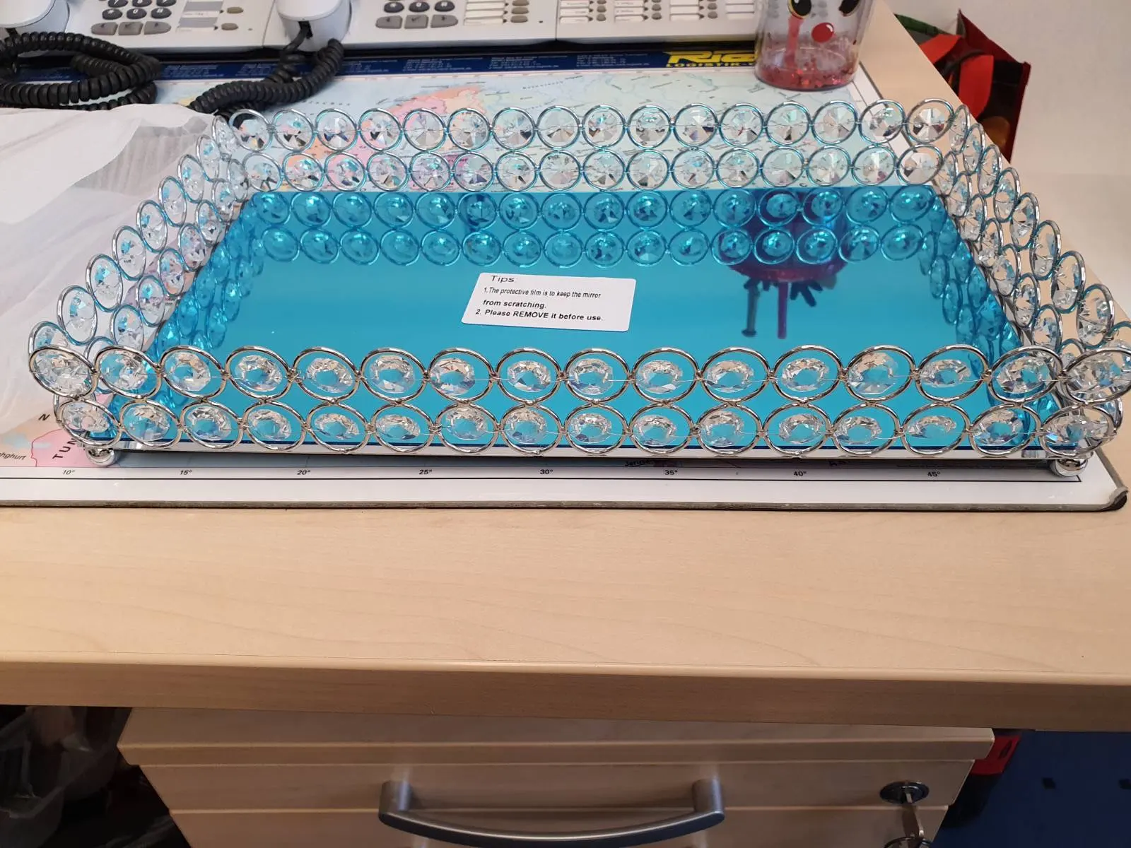 Симпатичный поднос, соответствует описанию продавца, правда зеркальное дно подноса выглядит как будто слегка поцарапанным, с разводами, на фото этого не видно.