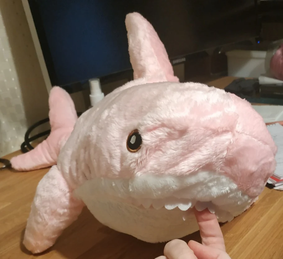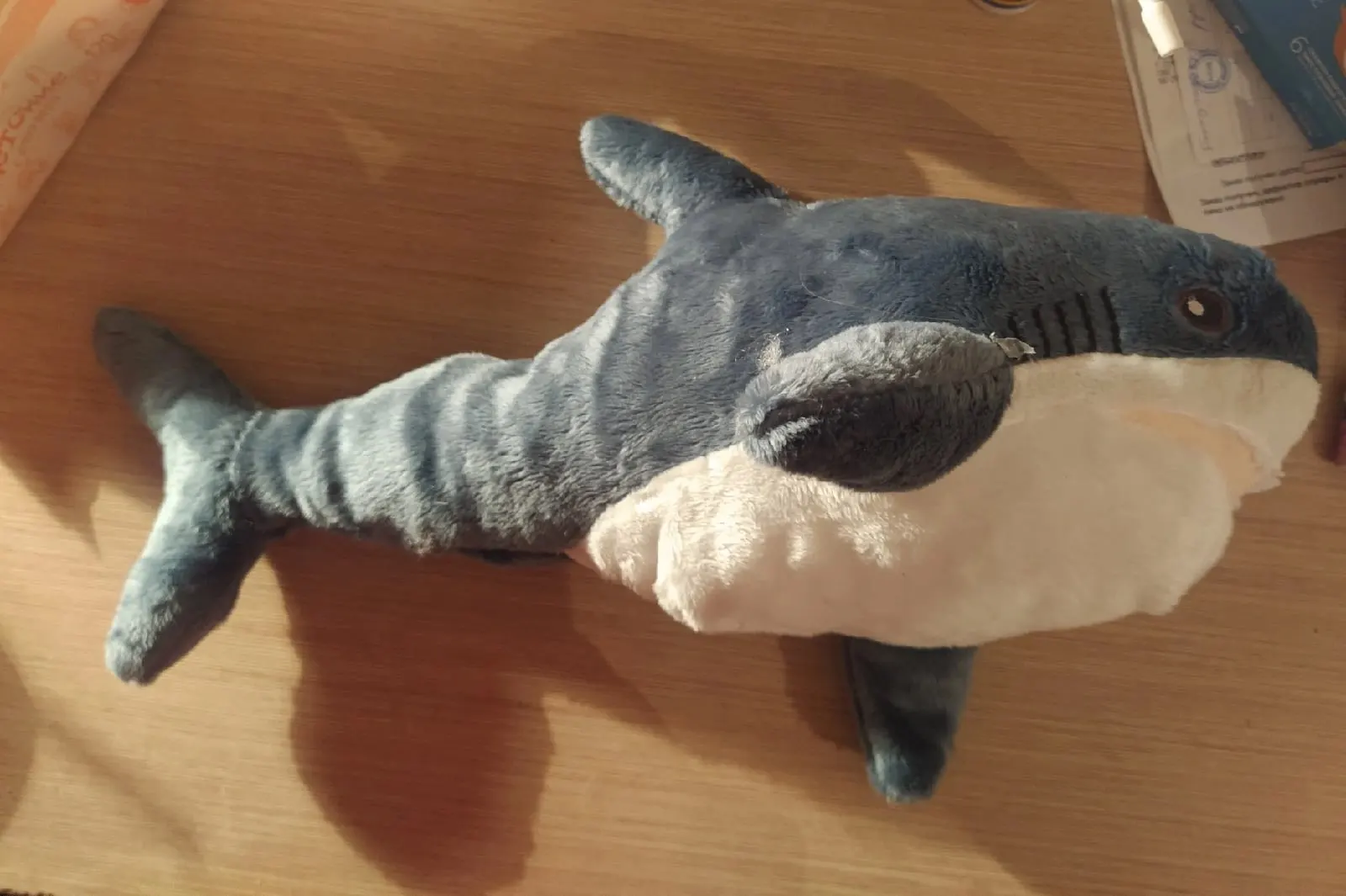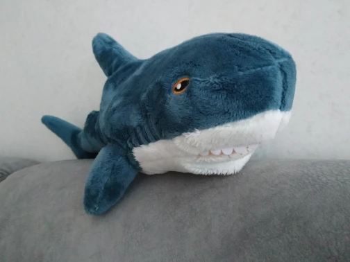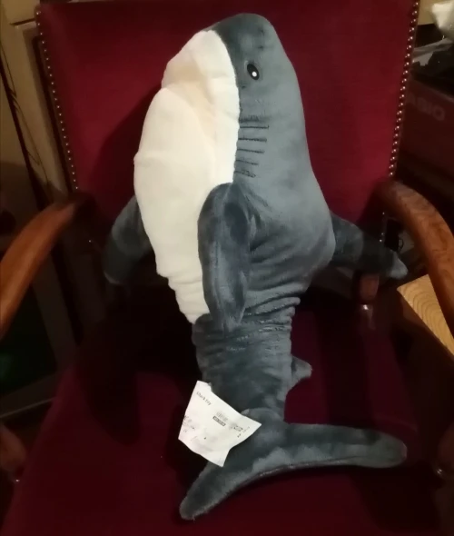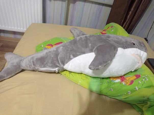 Классная акулка, все как на фото. Доставка 3 недели. Пришла с набивкой в пакете. Запаха нет. Швов не видно. Хороший товар. Продавцу спасибо