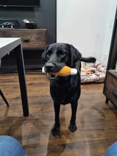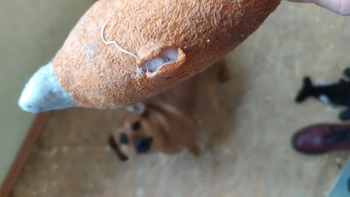 Отличная игрушка. Щенку понравилась. Пищалка внутри есть небольшая. Человек может нащупать пальцем, у собаки пока не получается. Доставилось быстро, за пару недель.