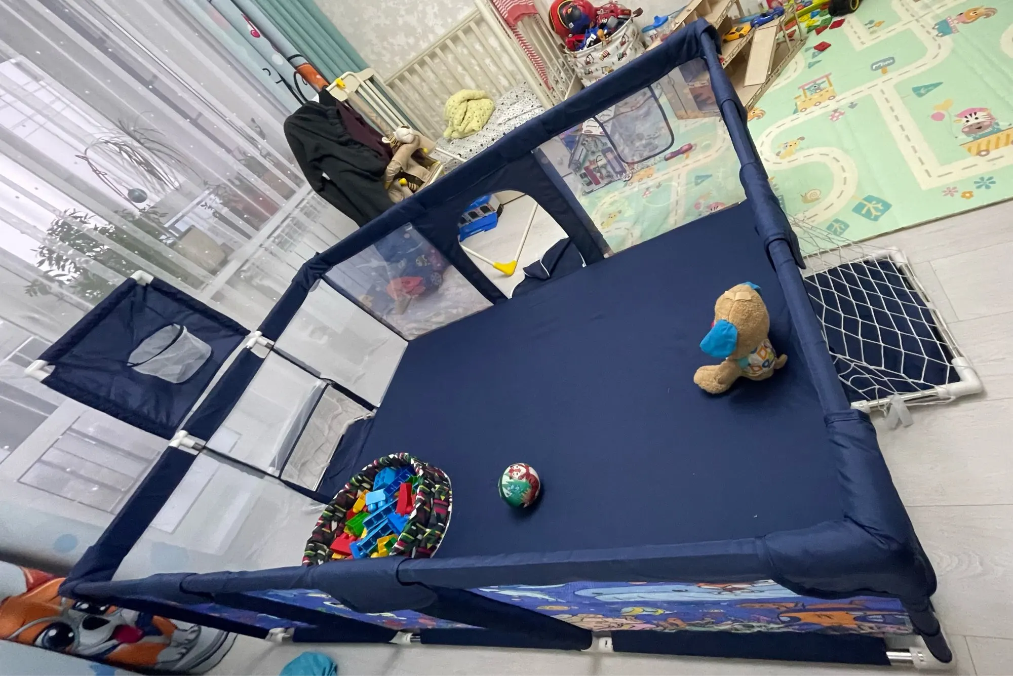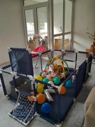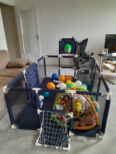 манеж хороший, ворота пока закрыли, но пришлось делать кнопки, чтобы плотно закрыть, дошел за 3 недели до Воркуты , с продавцом не общалась