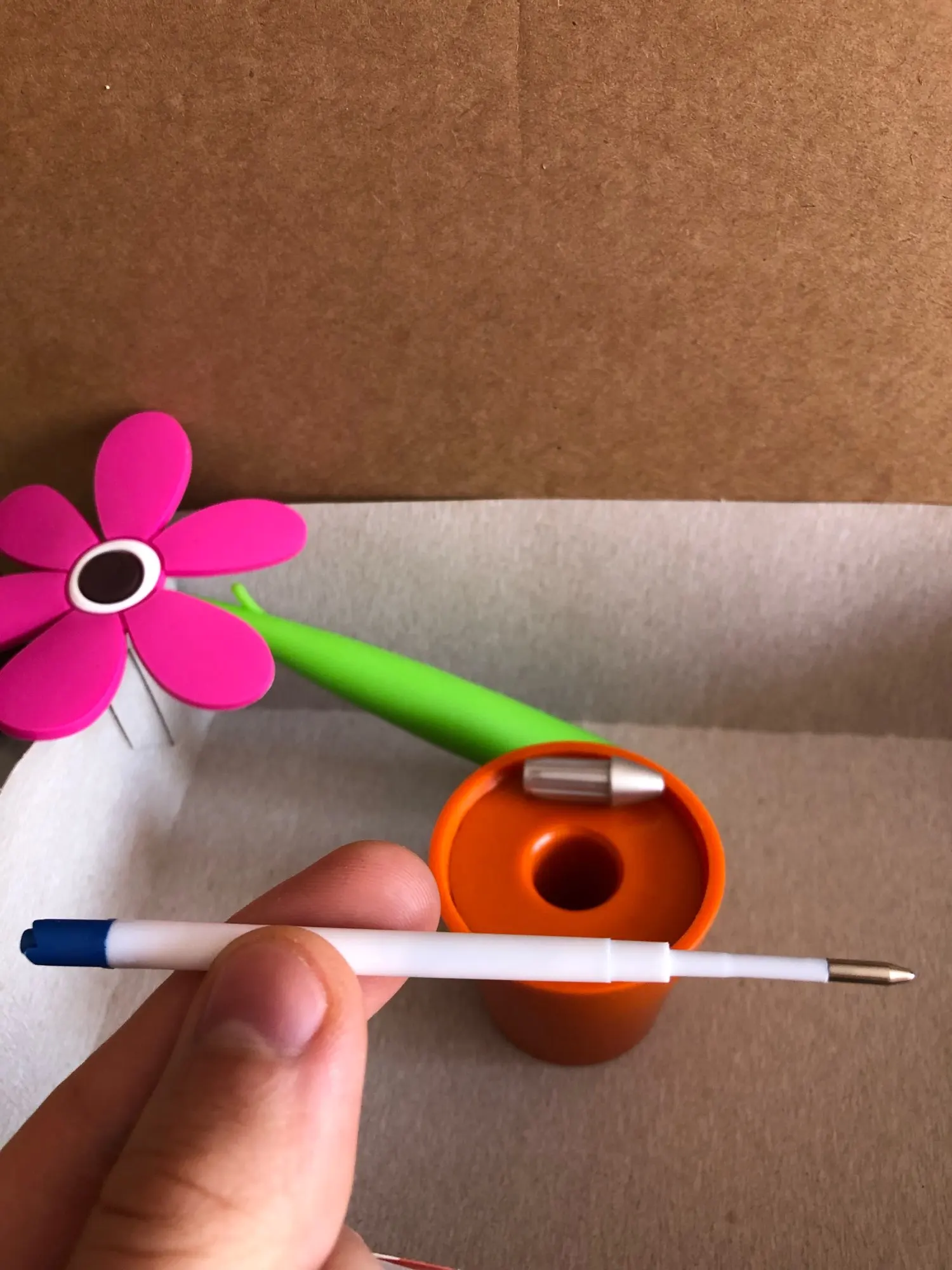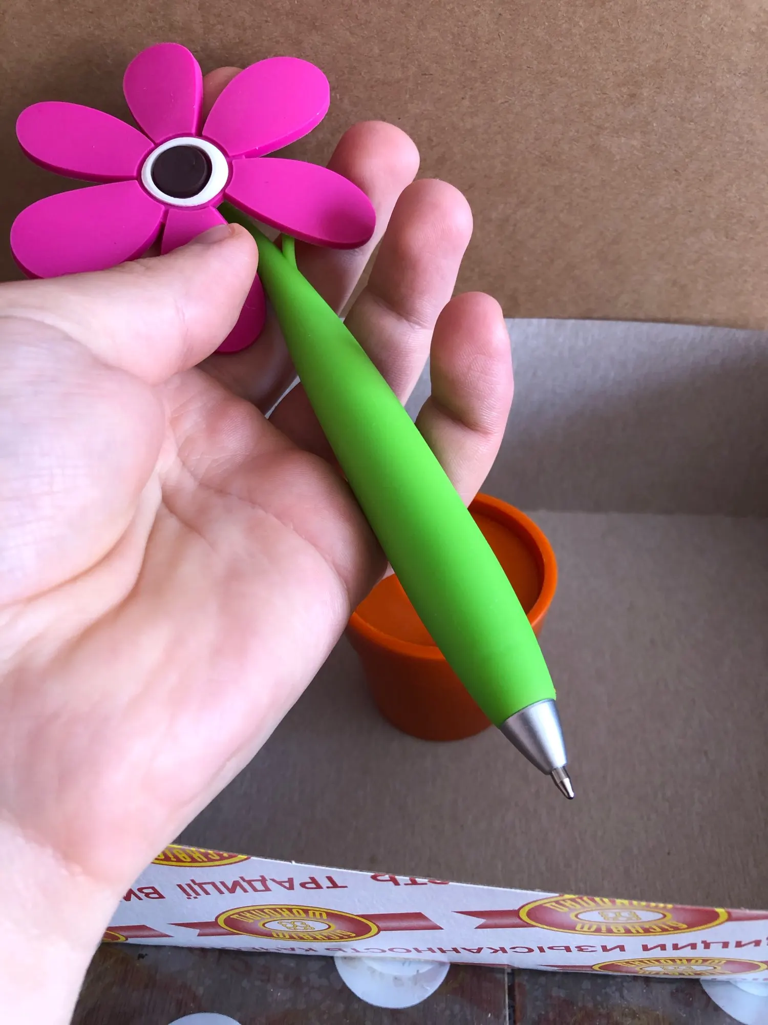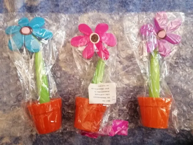 Интересная шариковая ручка, стилизованная под домашний цветок в горшочке. Доставка заняла около 20 дней, что в текущей ситуации очень даже быстро. Товар был упакован в обычный почтовый пакет и обмотан пупырчатой пленкой. Все три заказанные ручки пришли целыми, но из-за плотной упаковки некоторые лепестки погнулись. Горшочки и стебель (он же корпус ручки) выполнены из пластика. А вот сами цветки изготовлены из резины и от них исходит не очень приятный запах. Цвет, кстати, отличается от фото продавца - он не такой насыщенный. Высота цветка вместе с горшочком около 18 см, диаметр самого горшочка около 4 см, а ручки 1 см. Внутри самая обычная шариковая паста синего цвета, причем пишет она довольно толсто. Пасту можно заменить, для этого достаточно снять колпачок в нижней части ручки. Синий цветочек пришел с браком литья на корпусе и не держится в горшке, также на всех цветках есть облой, особенно между лепестками. Для своей цены очень даже неплохо, но хотелось бы контроль качества получше.