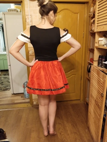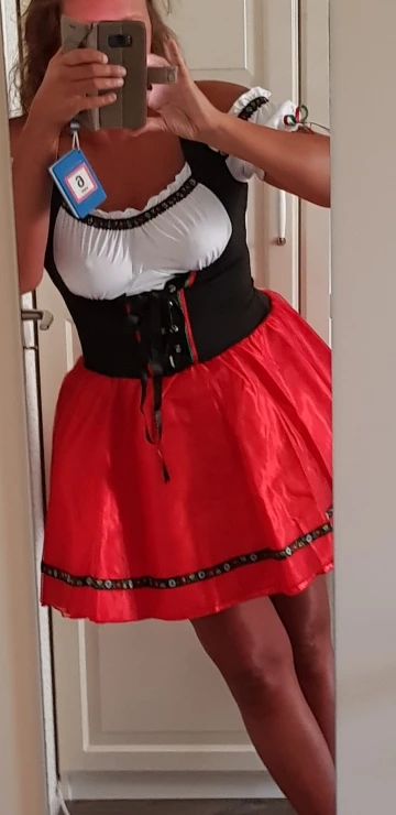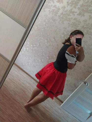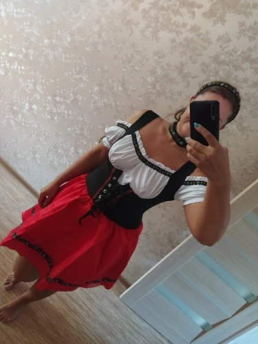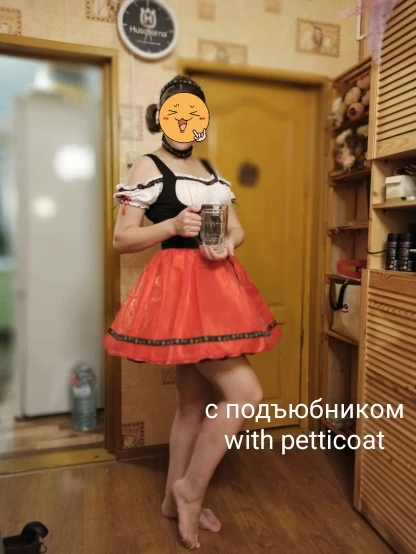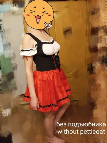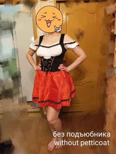 Хорошее платье. Ткань тонкий синтетический трикотаж, очень хорошо тянется! Поэтому с размером, кажется, я немного ошиблась. Взяла XL на груди 96, талия 80, бёдра 116, рост 176. Наверно, лучше было бы меньший размер, так как шнуровку приходится затягивать полностью. Кое-где неровно немного сшито. Юбка из 3х слоёв: сверху прозрачная красная органза (как прозрачная лента), потом красный атлас, внизу черная сетка. Семка очень сильно колется! Я отдельно купила чёрный пышный подъюбник - с ним вообще отлично - юбка сидит пышно как надо. В комплекте ободок и чокер.