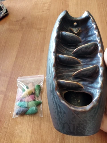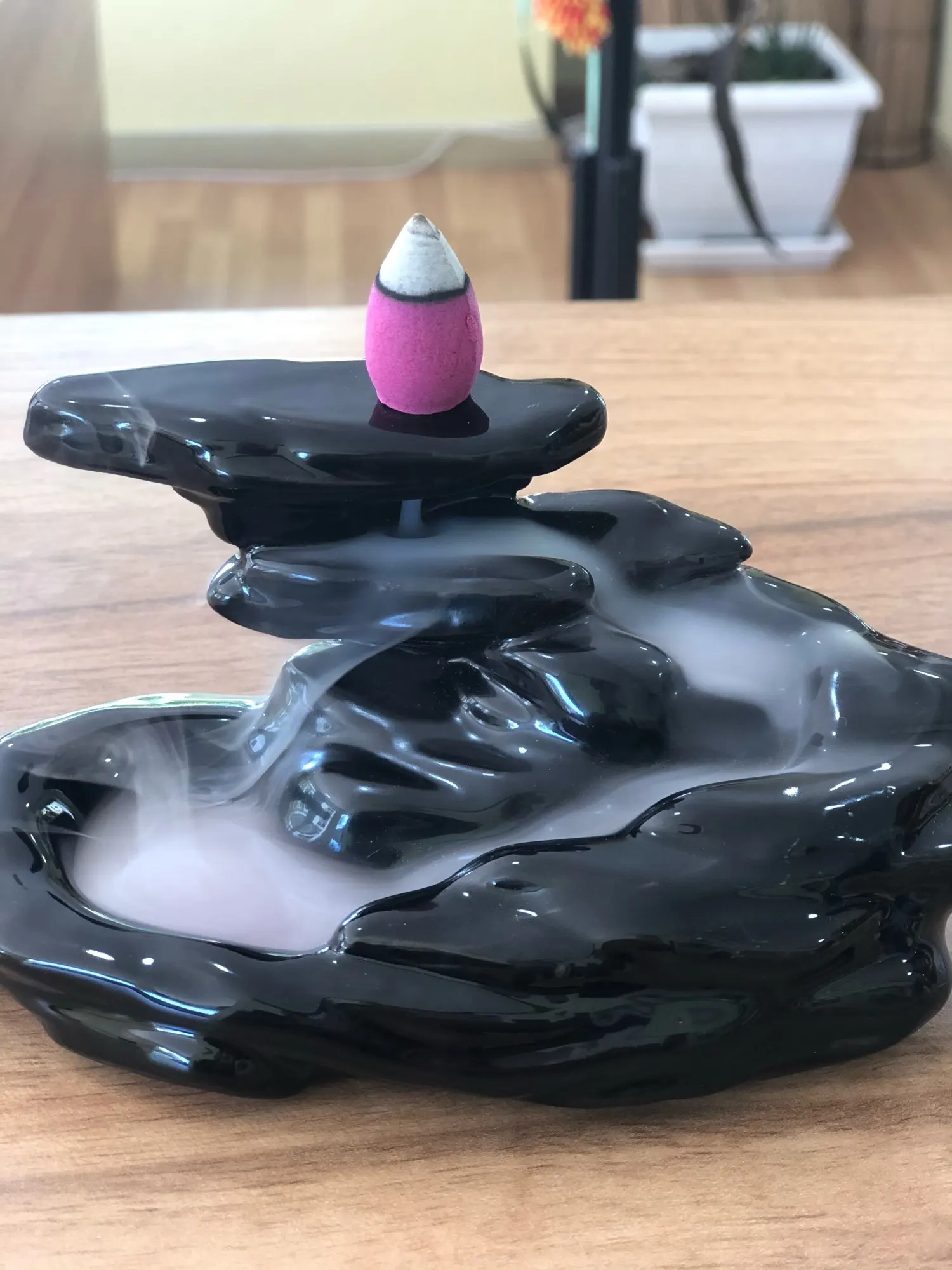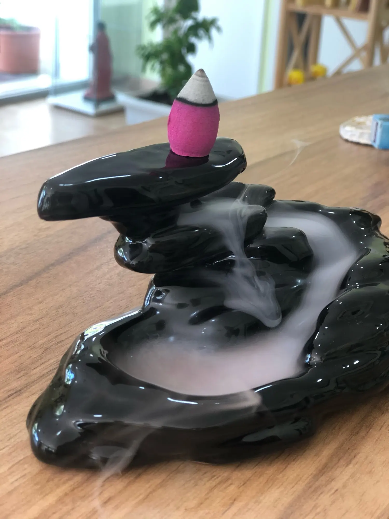 После того как половина прогорает и начинается нагреваться дно(там где стоят благовонья) - дым начинает выходить через отверстие и тут же закручивается и поднимается вверх из-за нагретого основания где стоит свечка. Он перестает "течь" вниз...