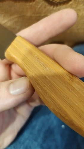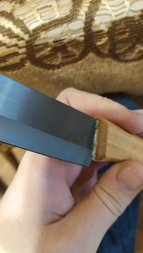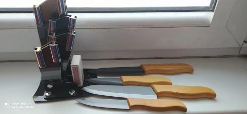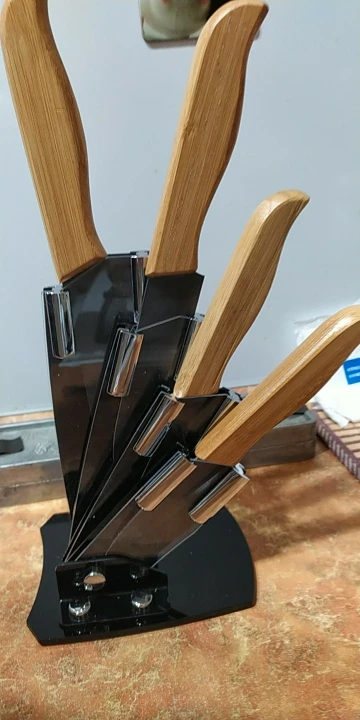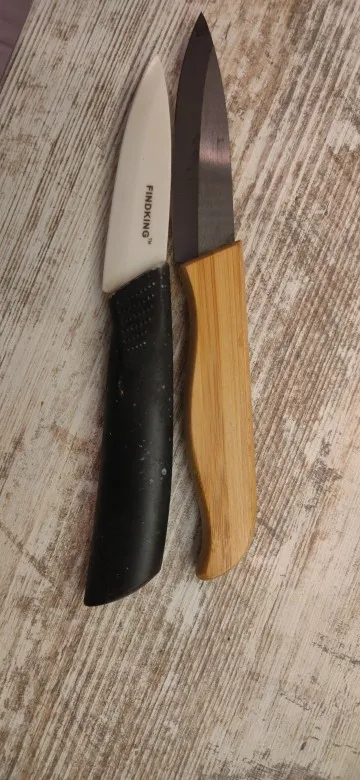 Это третья партия файндкиндов. С одной стороны, наши поднебесные братья улучшили качество лезвий, с другой, по прежнему ищут свой дзен-путь, обивая косяк за косяком. В "родную" подставку ножи влезли, но не все, 5" упирается, сравнил в такой же подставкой трёх лет от роду, размеры ножен не совпали. Ручки с пропиткой, но видны швы от склейки. Будем посмотреть насколько хлипкий там клей. Из коробки режут пристойно, черная керамика красивая, но маркая, если вода жесткая. Чехлы на лезвия не положили, благо были на старых. На 4- потянут, не более.