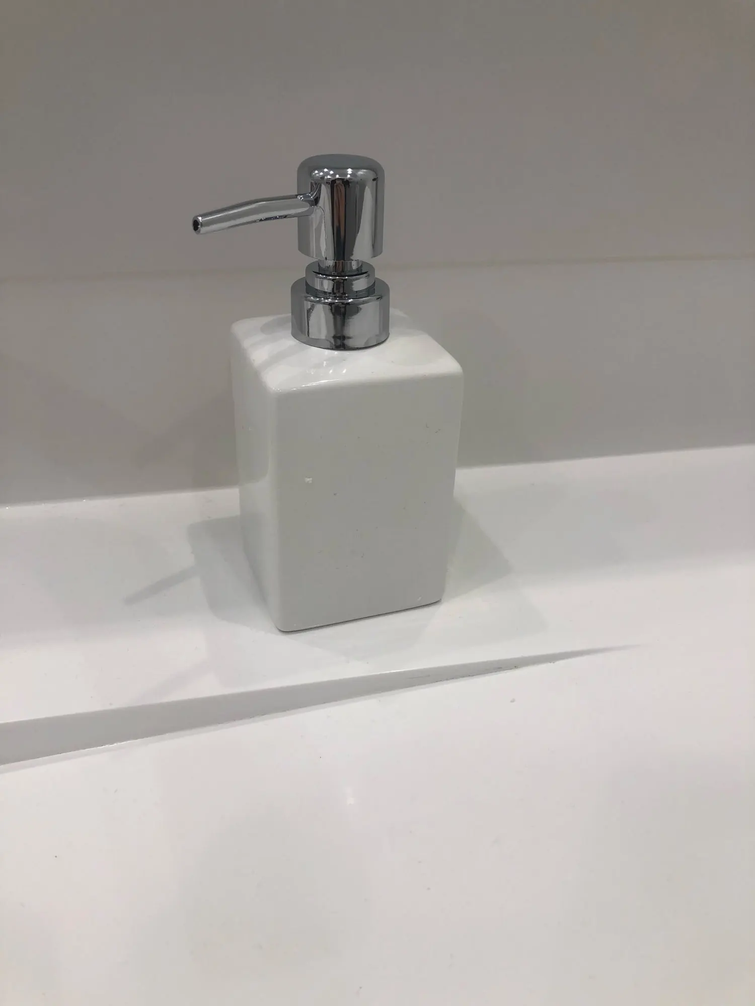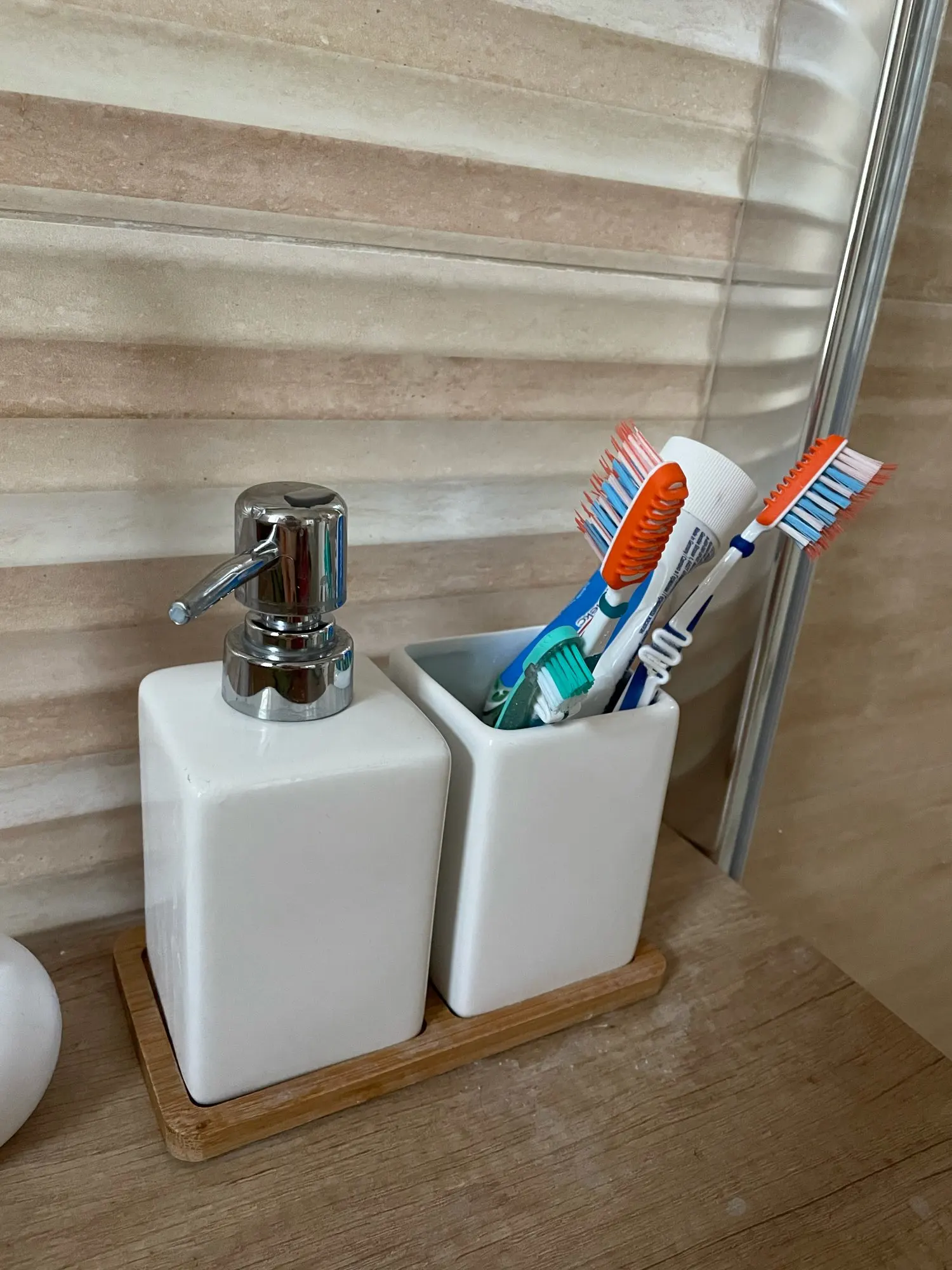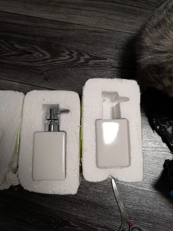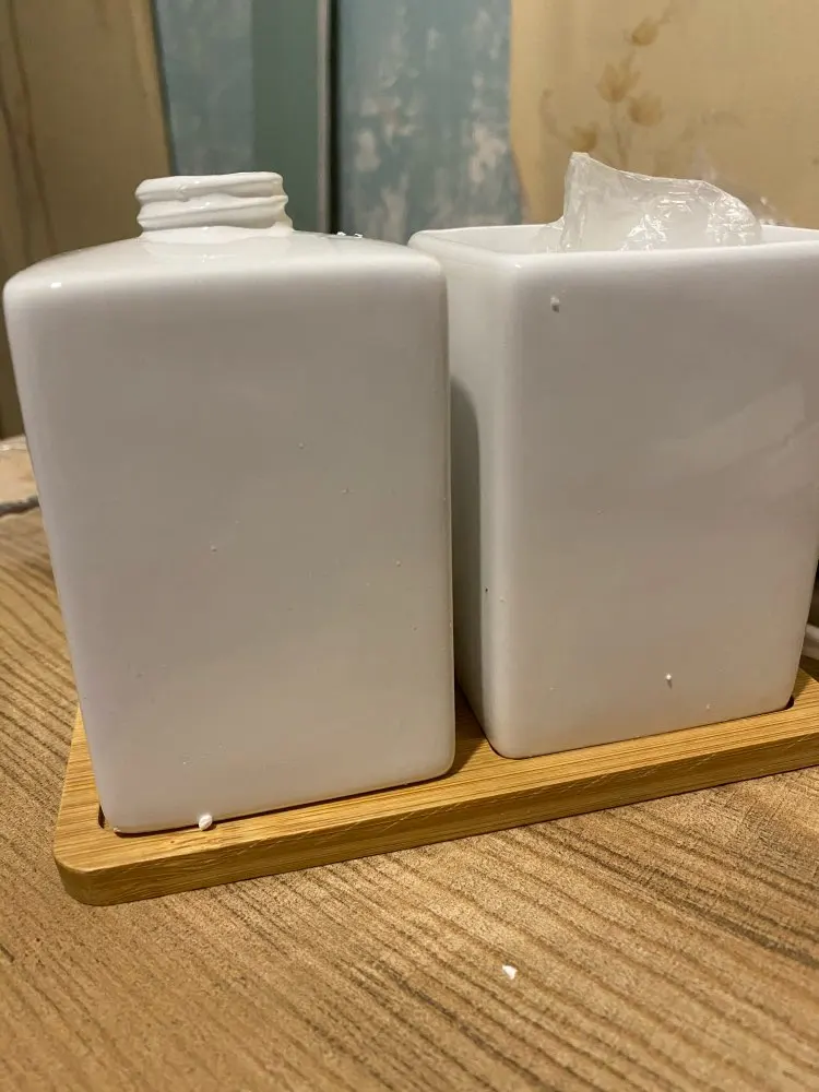 хороший керамический набор. Сосок у диспенсера пластик. Деревянный поднос имел небольшие сколы.