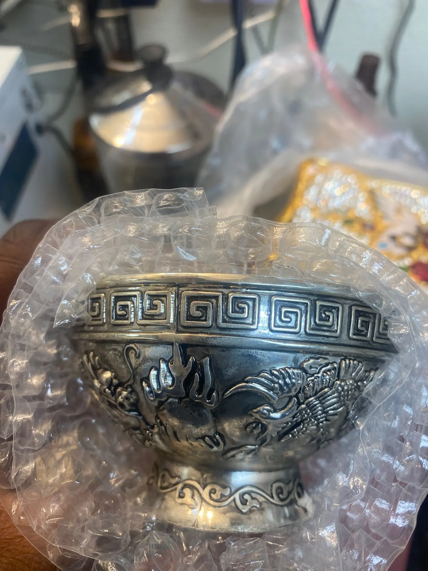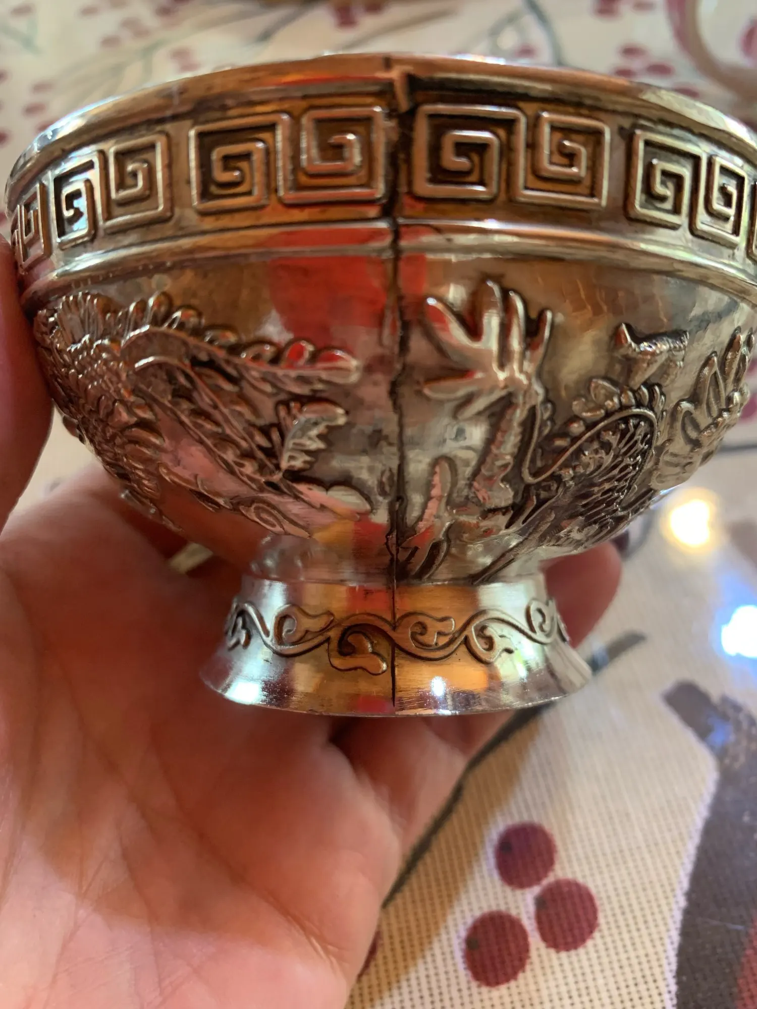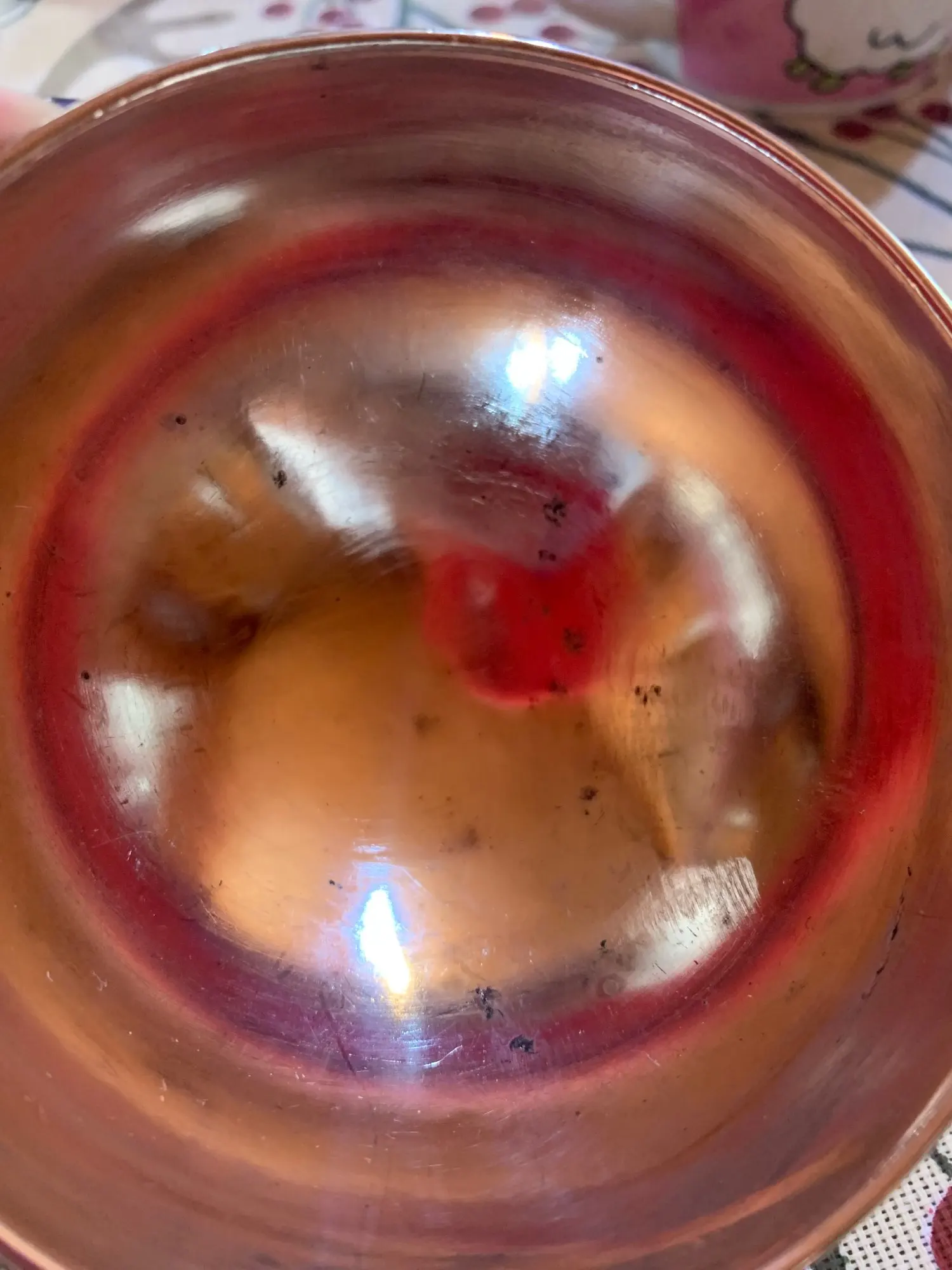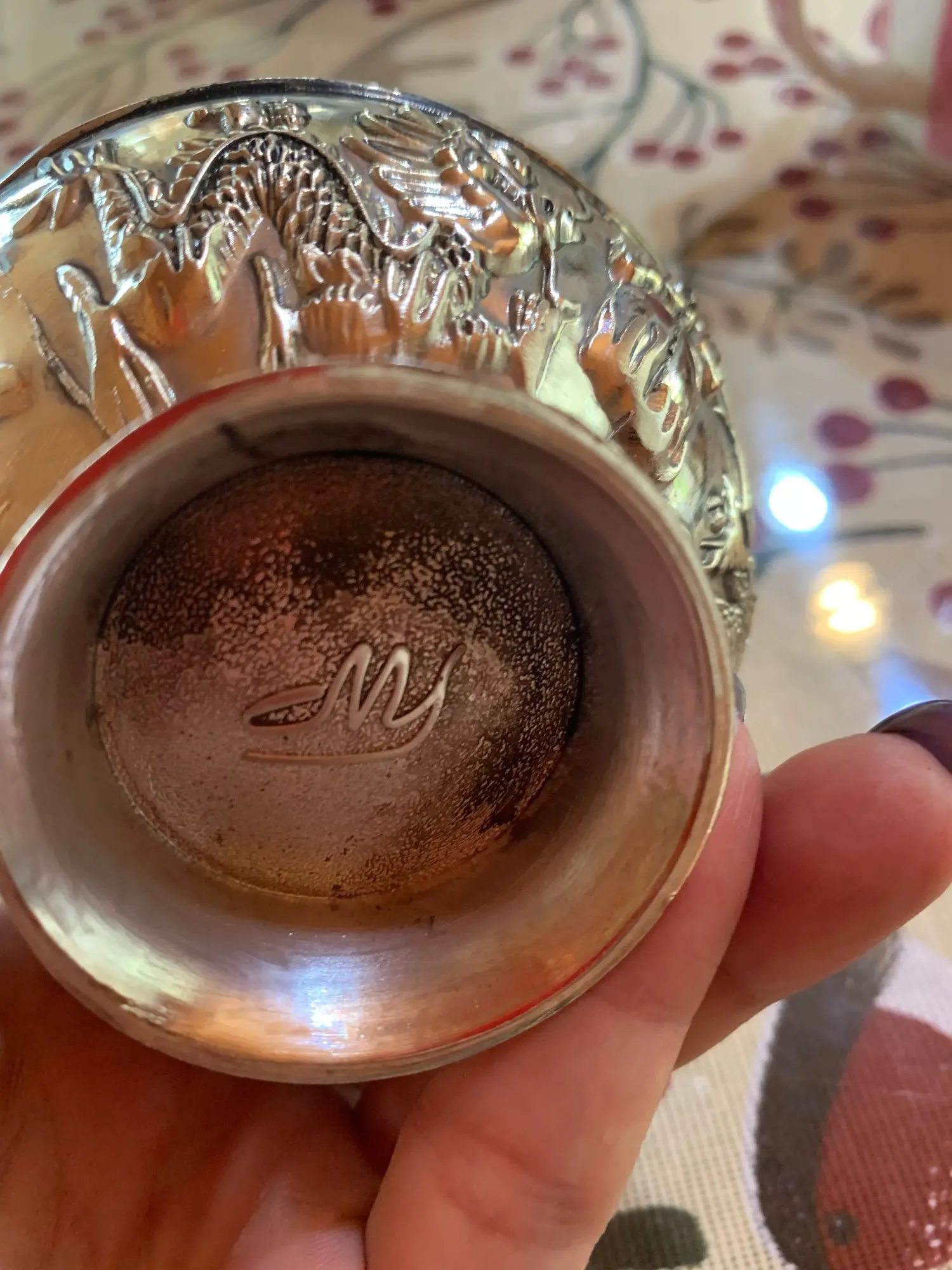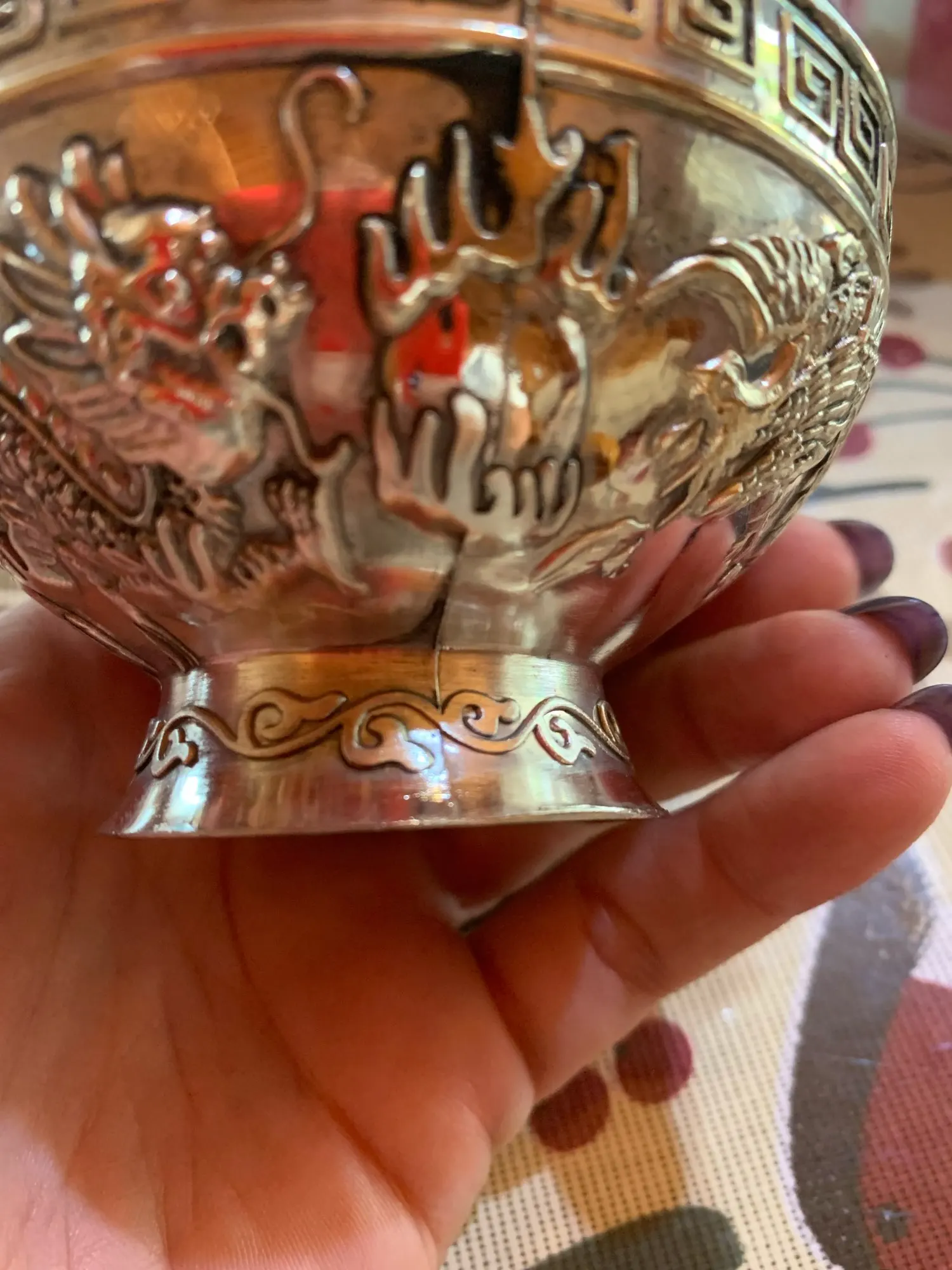Второй раз заказываю эту чашу, была очень довольна первой, это был отличный подарок, ювелирная работа. Эту чашу сделали очень грубо, плохое покрытие, грубые стыки. Внутри черные точки и кляксы. Это работа не ручная, а ножная.