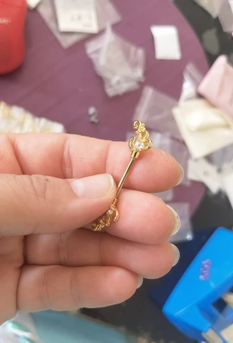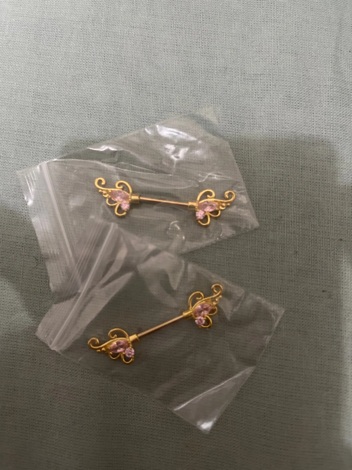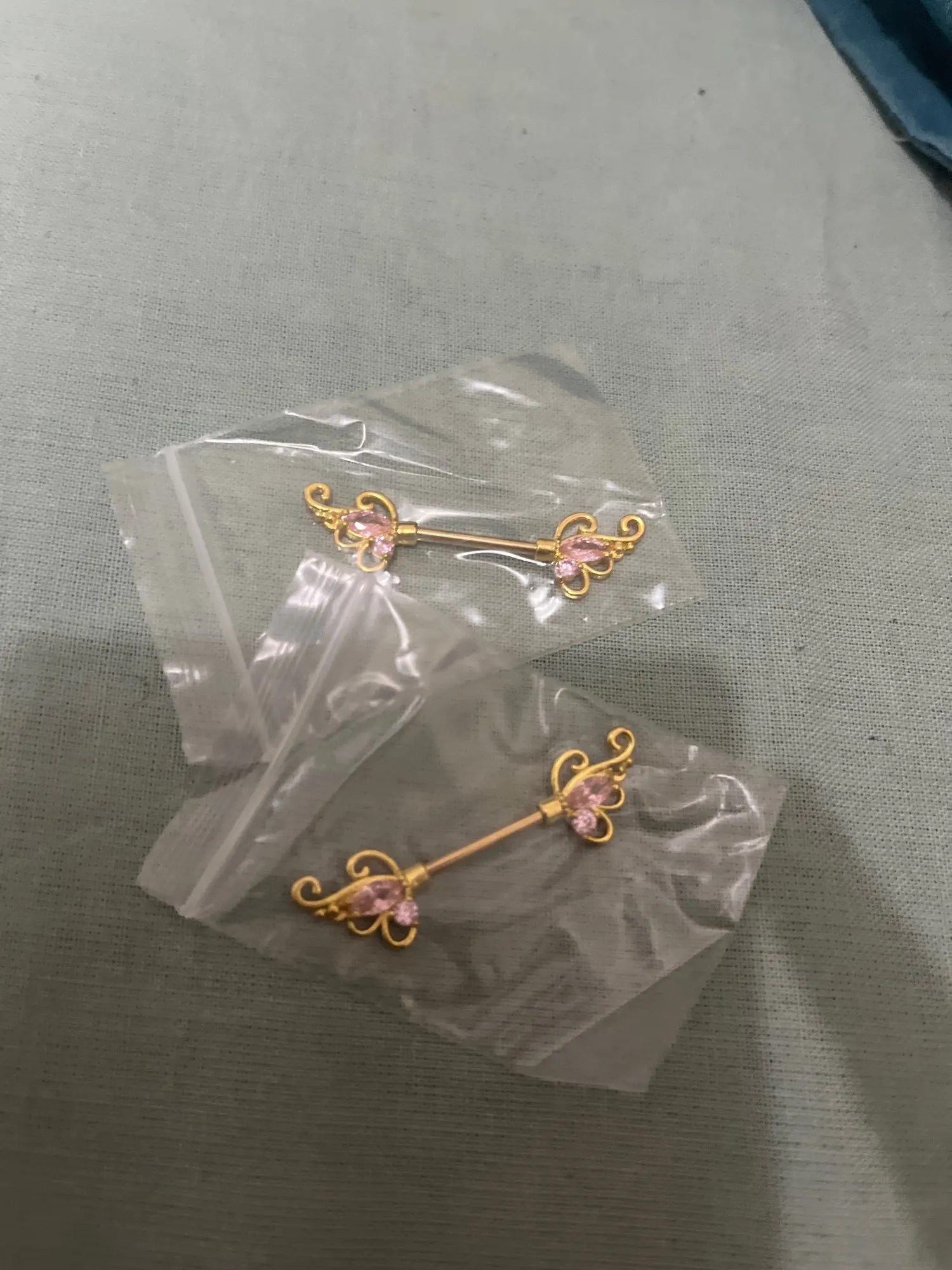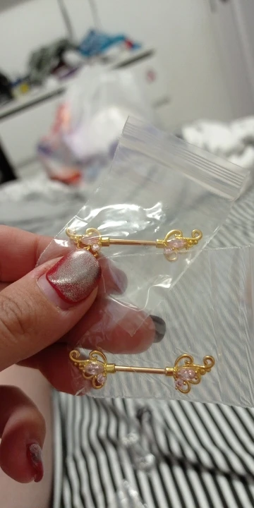 Golden and silver barbell. White and pink gemstone nipple rings