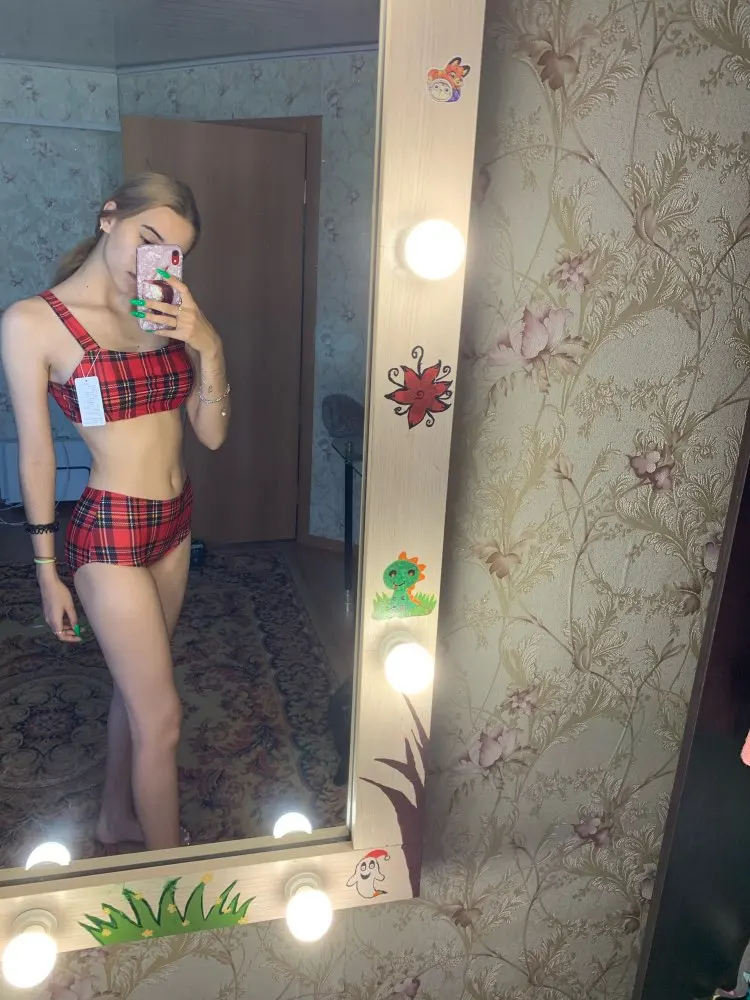На модели трусы смотрятся на много выше, а лиф шире, чем в реалии. Ткань тонковата, не просвечивает за счет подкладки. Сшит аккуратно, но по фигуре садится плохо. Трусы в паху собираются в складки, лиф подмышками топорщится, грудь приплюснута.