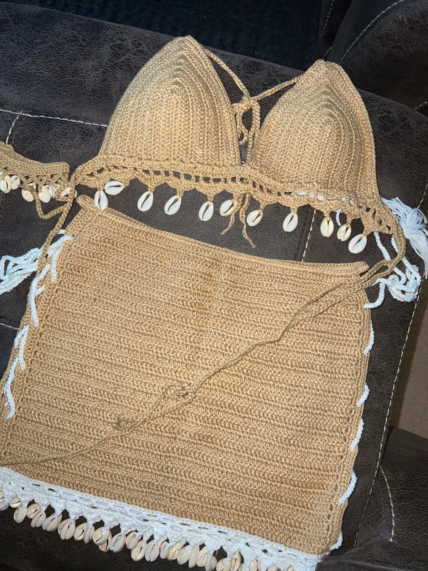 Комплект бикини женский 3 шт., кроше ракушки с кисточками, Топ бикини и ракушка с ракушками, пикантная пляжная юбка с цепочкой на щиколотке, к...