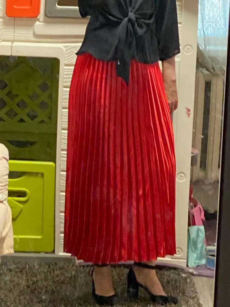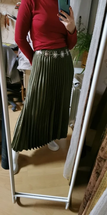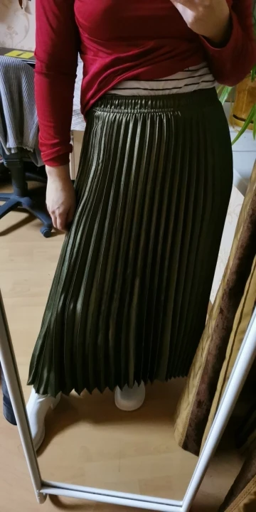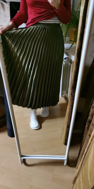 Отличная юбка. Не скажу что она меня худит, но и не сильно жирнит (для плиссе). Мой рост 165 бедра 98. Ткань добротная и тяжёлая, все выглядит качественно. Честно сказать я такого качества даже в магазине давно не встречала. Если кто хочет, но есть сомнения, скажу что юбка однозначно стоит своих денег. Цвет армейский зелёный - просто гипноз.