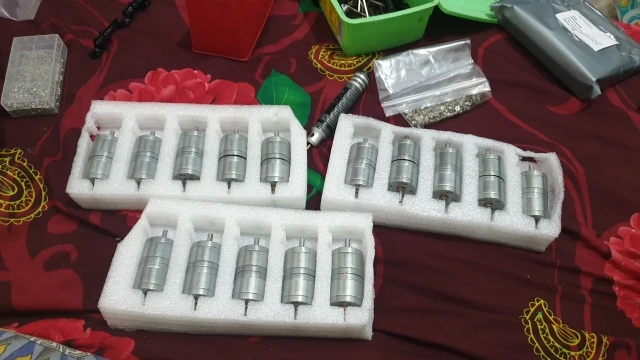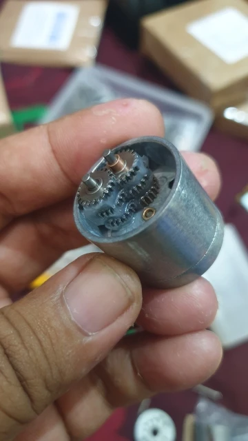 В комплекте оказалась входная шестерня на мотор, внутренний диаметр 2 мм, 12 зубьев, модуль 0.4, наружный диаметр 5.6 мм, высота 2.5 мм. Очень приятно, что не надо искать эту шестерню отдельно, можно сразу одеть ее на безколлекторный мотор, а коллекторный отложить.