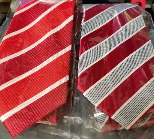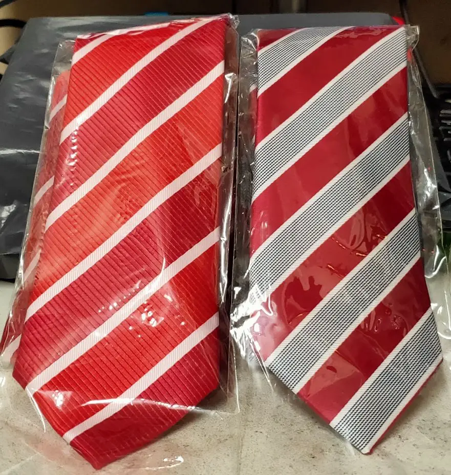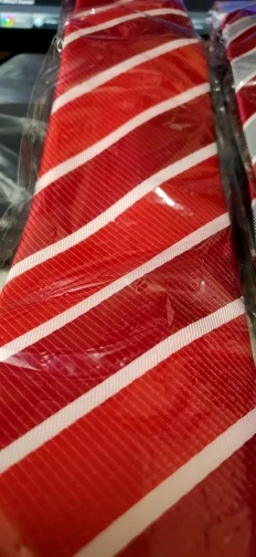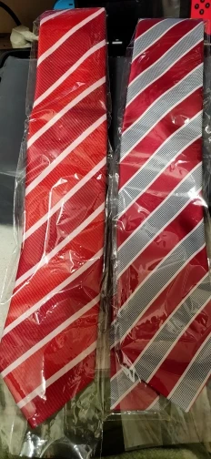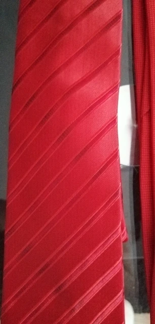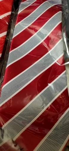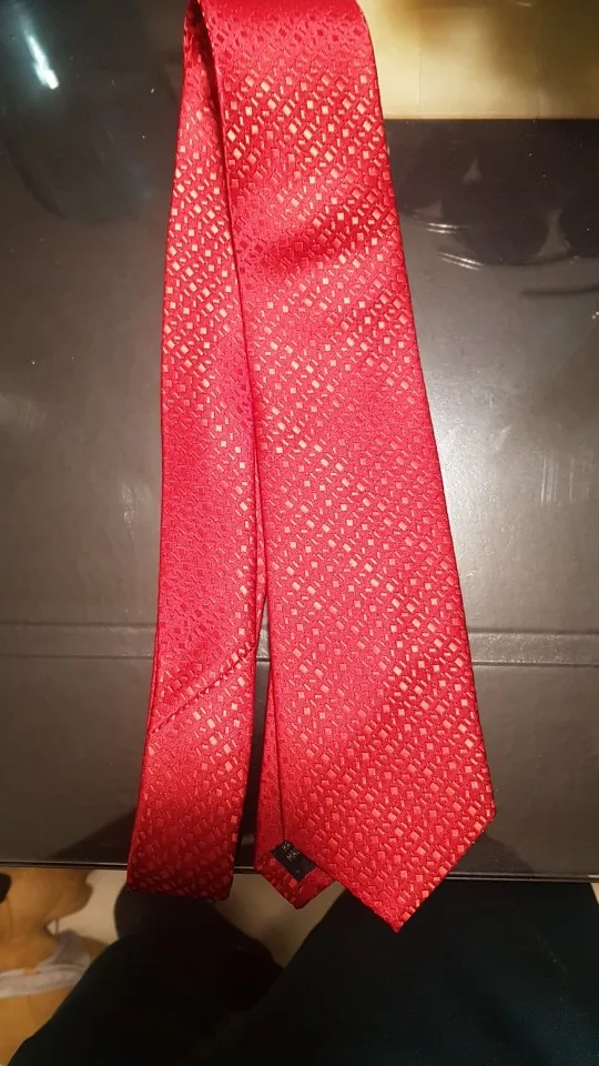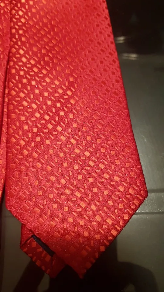 На самом деле хороший галстук. Узор интересный, ткань без дефектов. Проблема в том, что его транспортировали в сложенном, а не в свернутом состоянии, и он немного помялся. Я пока не понял, как выгладить полиэстровый галстук, чтобы убрать эти легкие заломы, хотя бы на видимой части.
