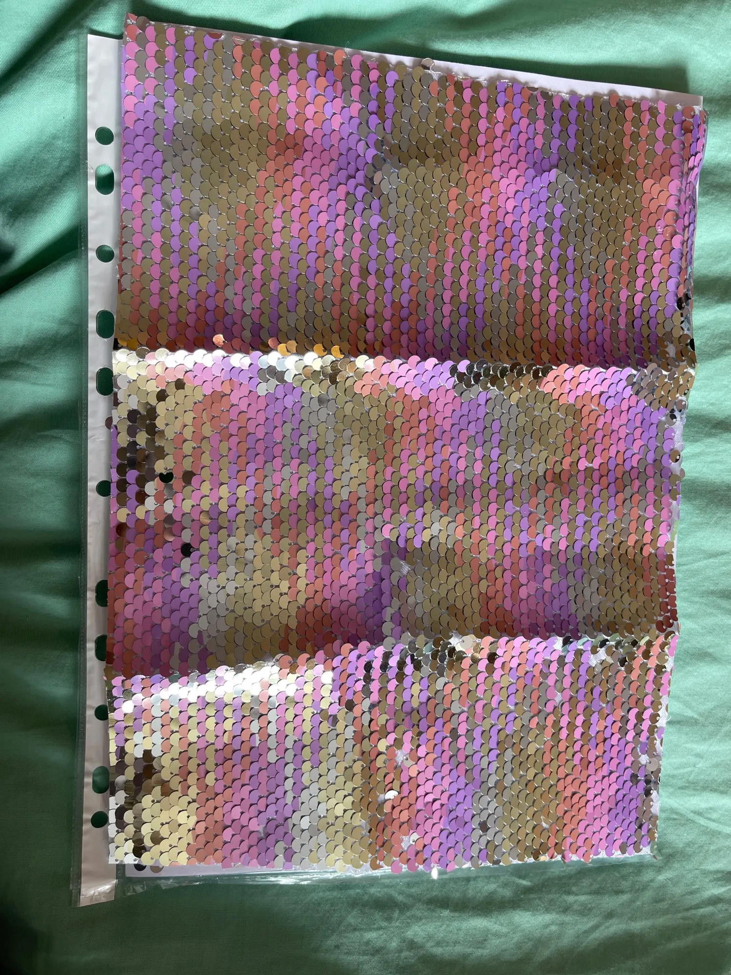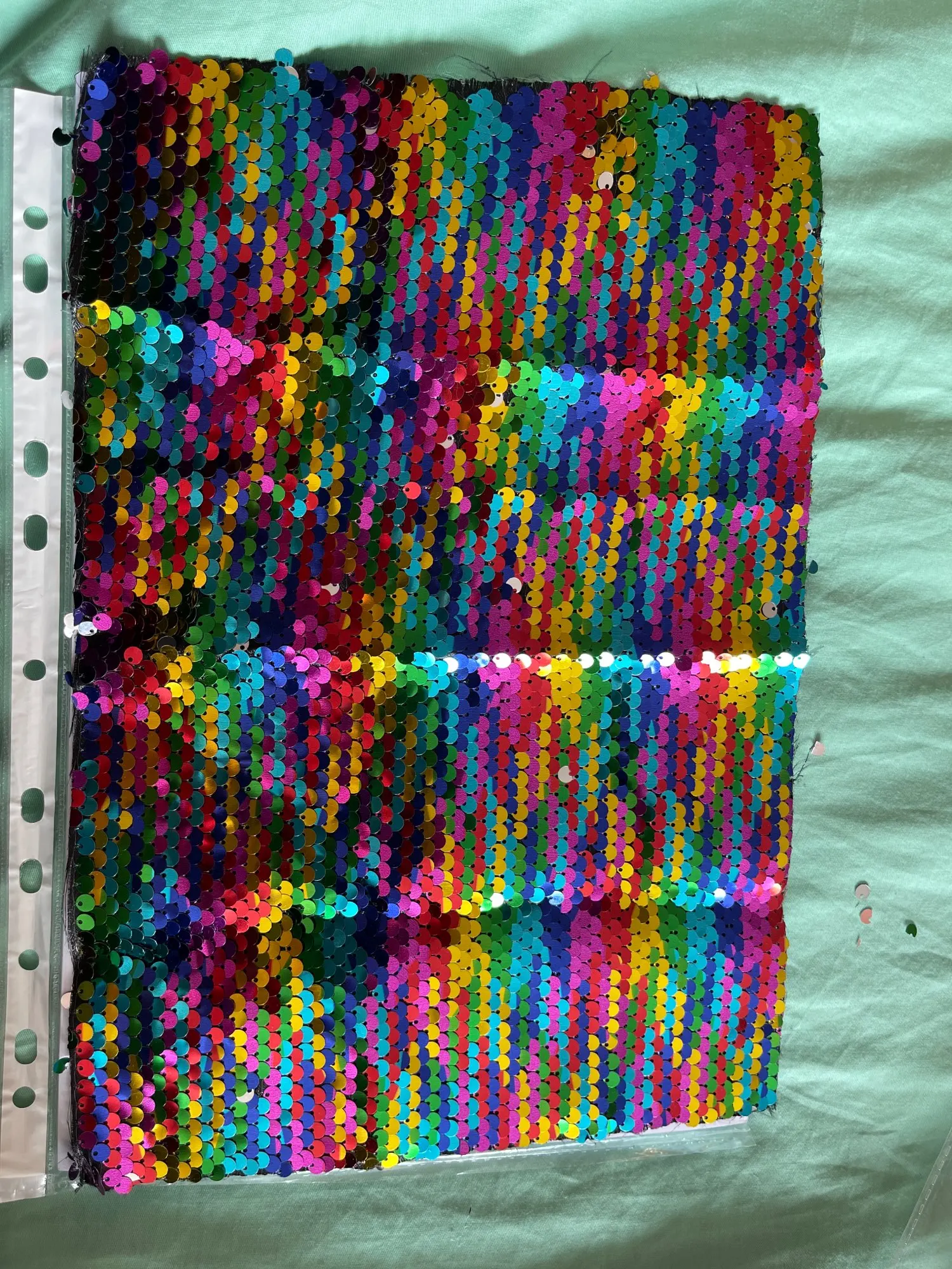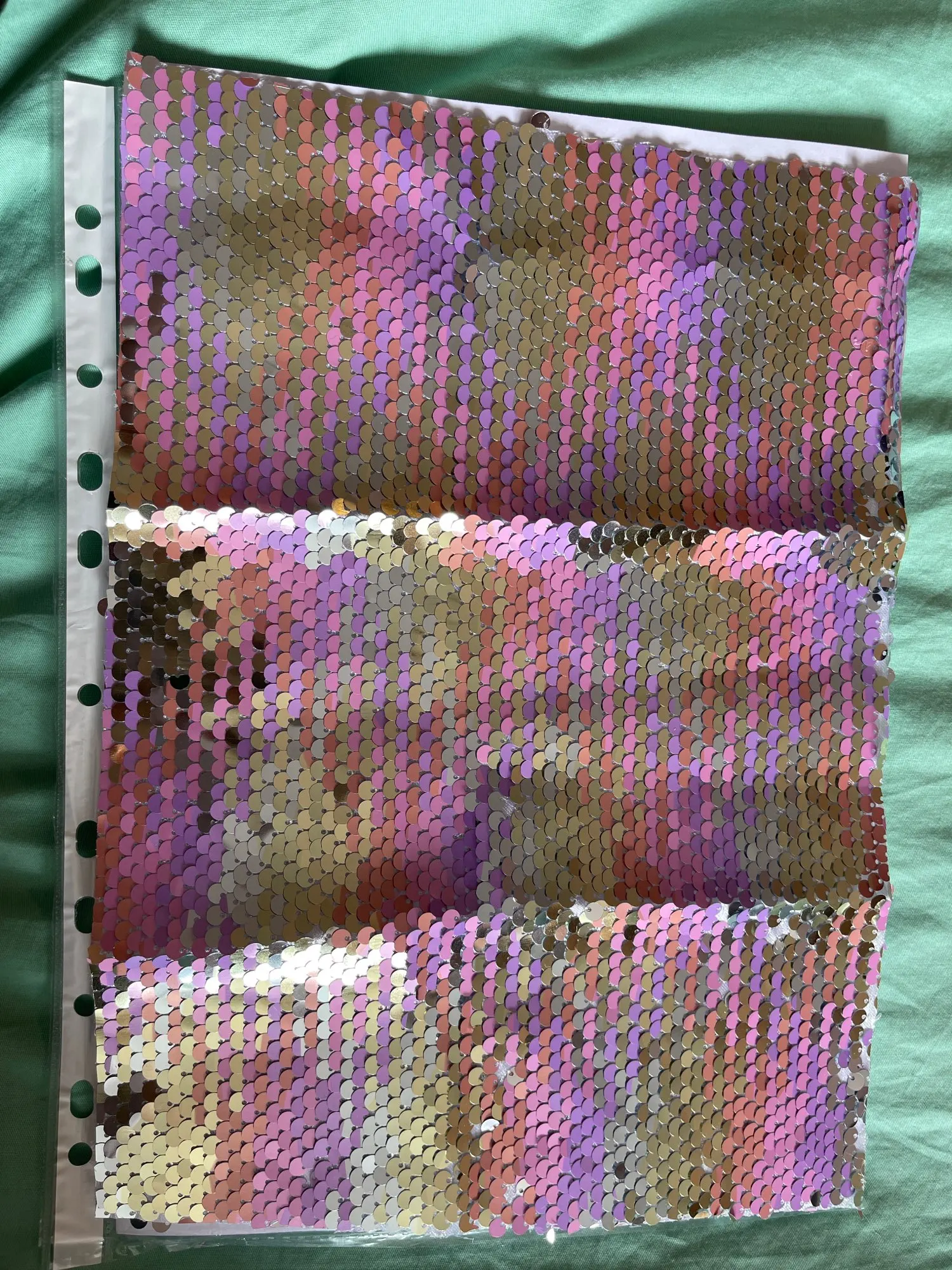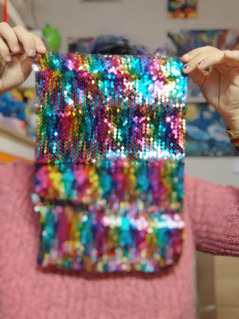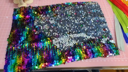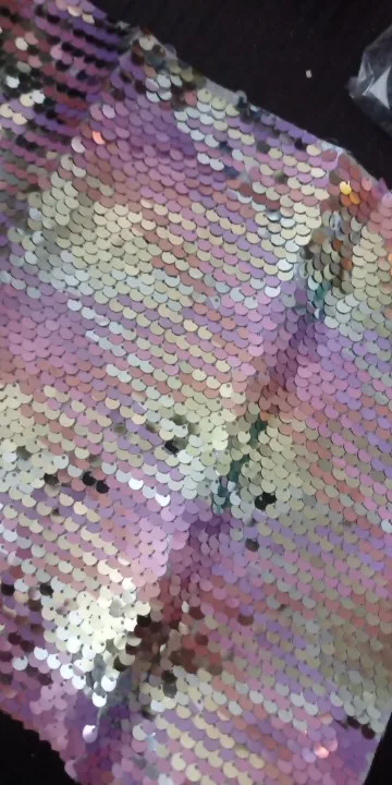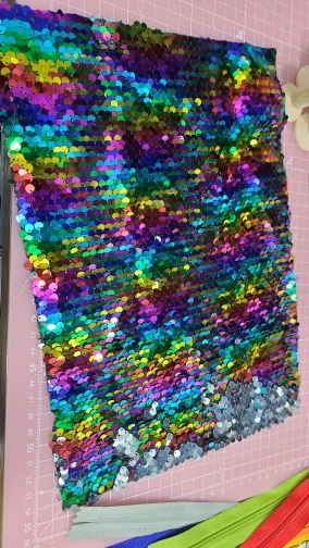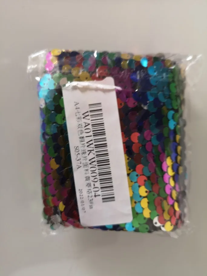 Качество не понравилось, часть пайеток приходится переворачивать по отдельности, отрезан край криво.
