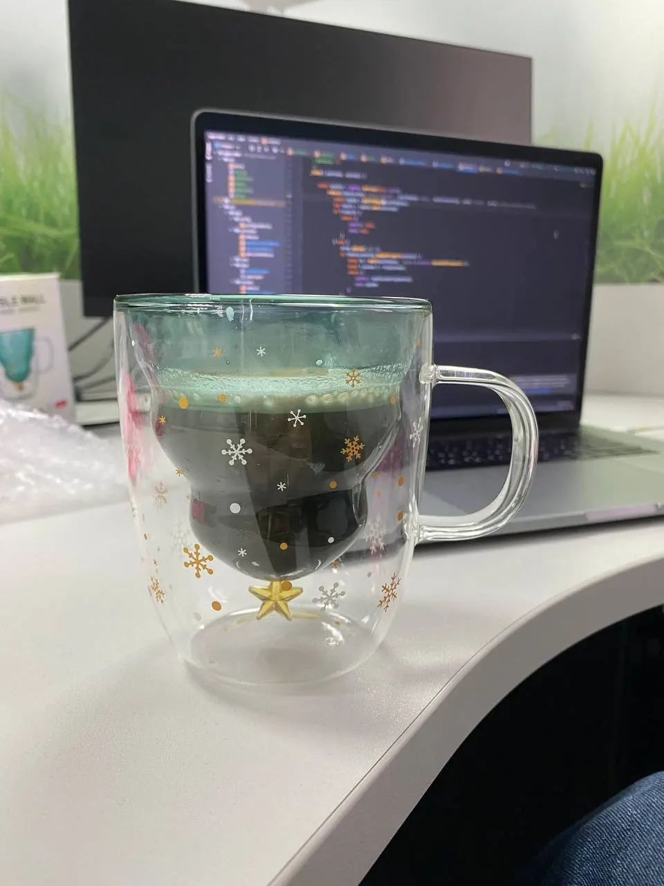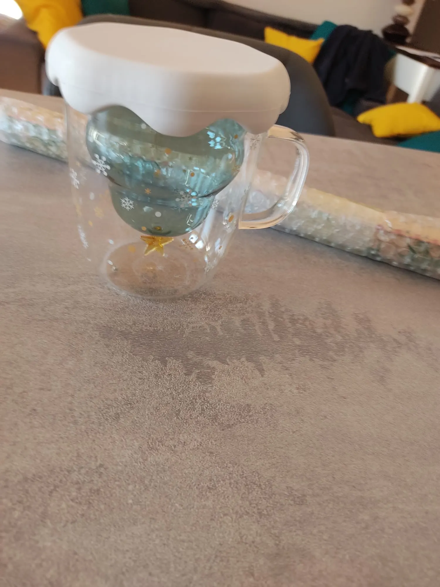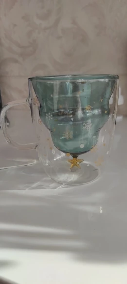 Чашка изумительная! Поразила своей красотой меня и детишек. Муж так же не остался в стороне) Эта елочка в стекле приносит то самое чувство из детства, когда сидишь с родителями за столом и ждешь новогоднего чуда. Но многие люди среднего возраста ( и старше) к сожалению утратили это чувство волшебства... Однако, трактовать этот предмет можно и по другому. Раньше мы были детьми и наполняли наши стаканы соком, колой или на крайний случай детским шампанским. А сейчас, мы пьем вино, ВЗРОСЛОЕ шампанское или даже водку... Вот что значит пустота внутри... Но нужно относиться к жизни позитивно!!!)) По этому всем рекомендую Ёлочку) (но за тонкое стекло снимаю одну звезду ( уже разбилась((()