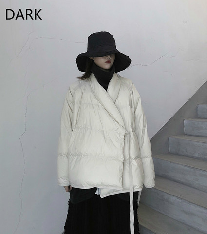 Куртка на белом утином пуху Driftwood Xi/yoj Yamamoto, легкая теплая куртка с темной пряжкой и косым кружевным ремешком