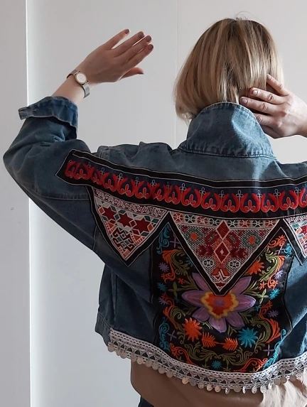 Куртка женская джинсовая в стиле бохо, винтажная верхняя одежда с цветочной аппликацией и вышивкой, жакет с длинным рукавом, одежда для весн...
