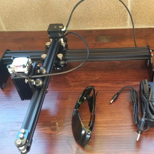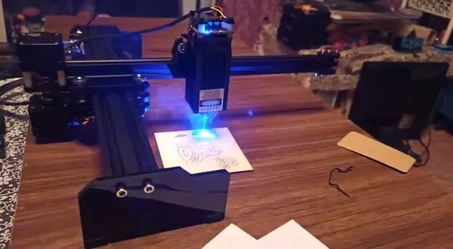 Не были припаяны 2 ножки на драйвер У из за чего рисунок уходил в сторону, иногда лазер просто останавливается и прожигает отверстие, надо быть внимательным. Фанеру 3 режет но только с подачей воздуха.