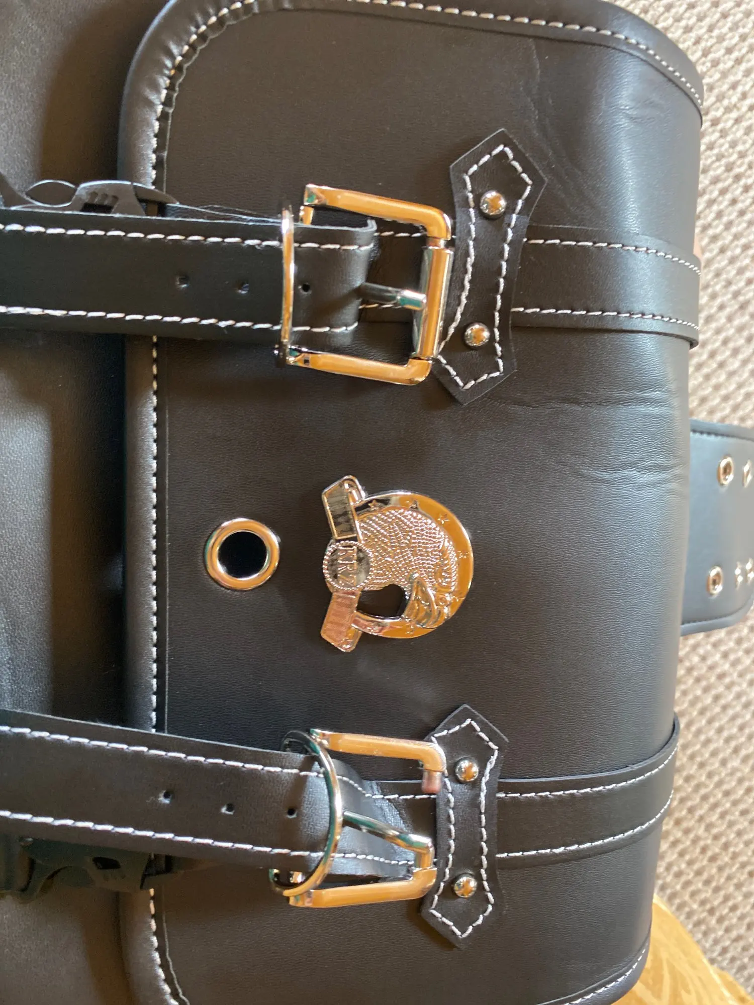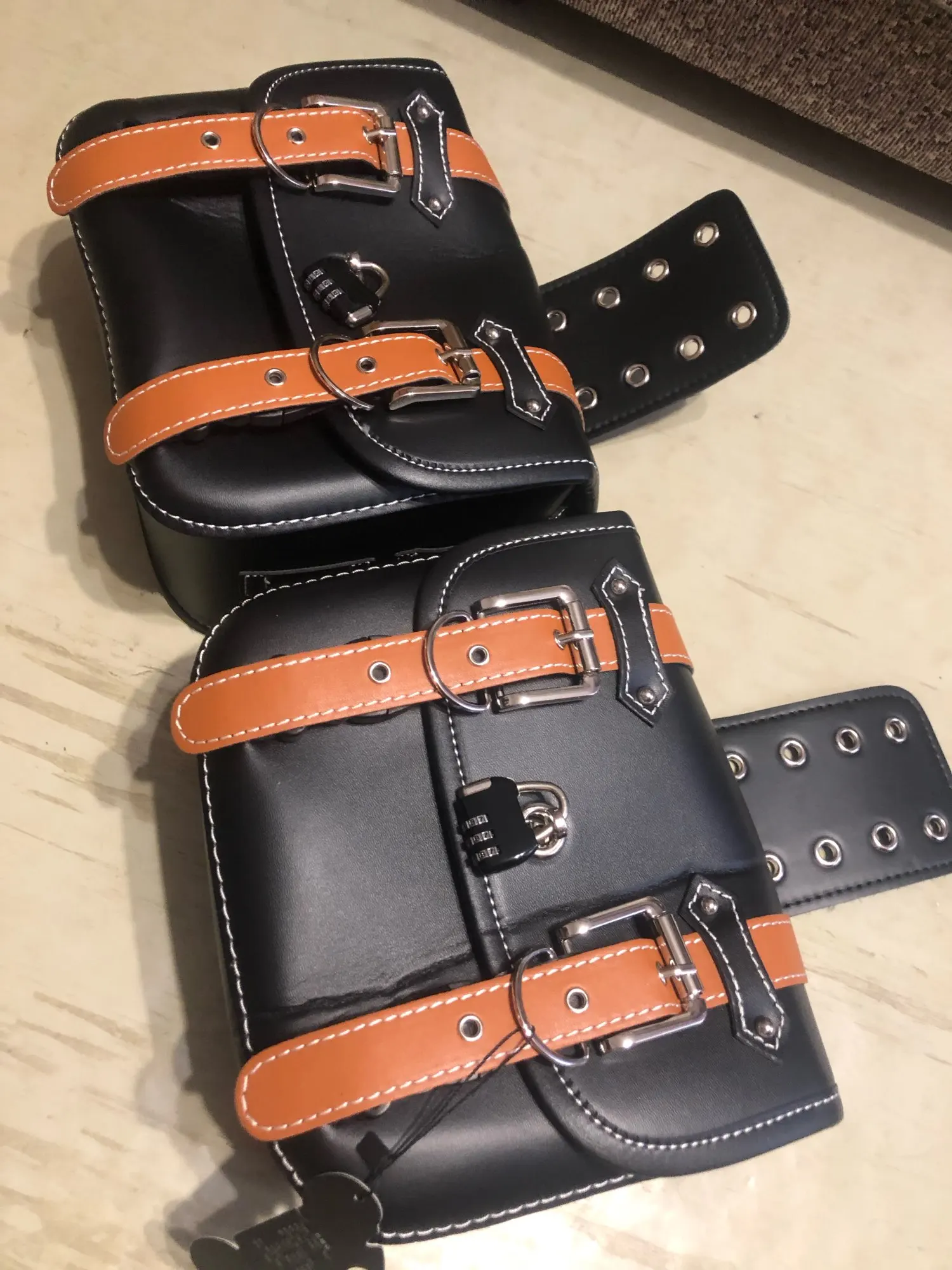 Впринципе все норм, кроме косяка на углу сумки. Явно хотели обрезать нитку на производстве ножом и промахнулись. А так комплект: две сумки деревяный дермантин, два недозамочка, кусок веревки небольшой и подбутылочница. Упаковка вполне себе имеет право на жизнь.