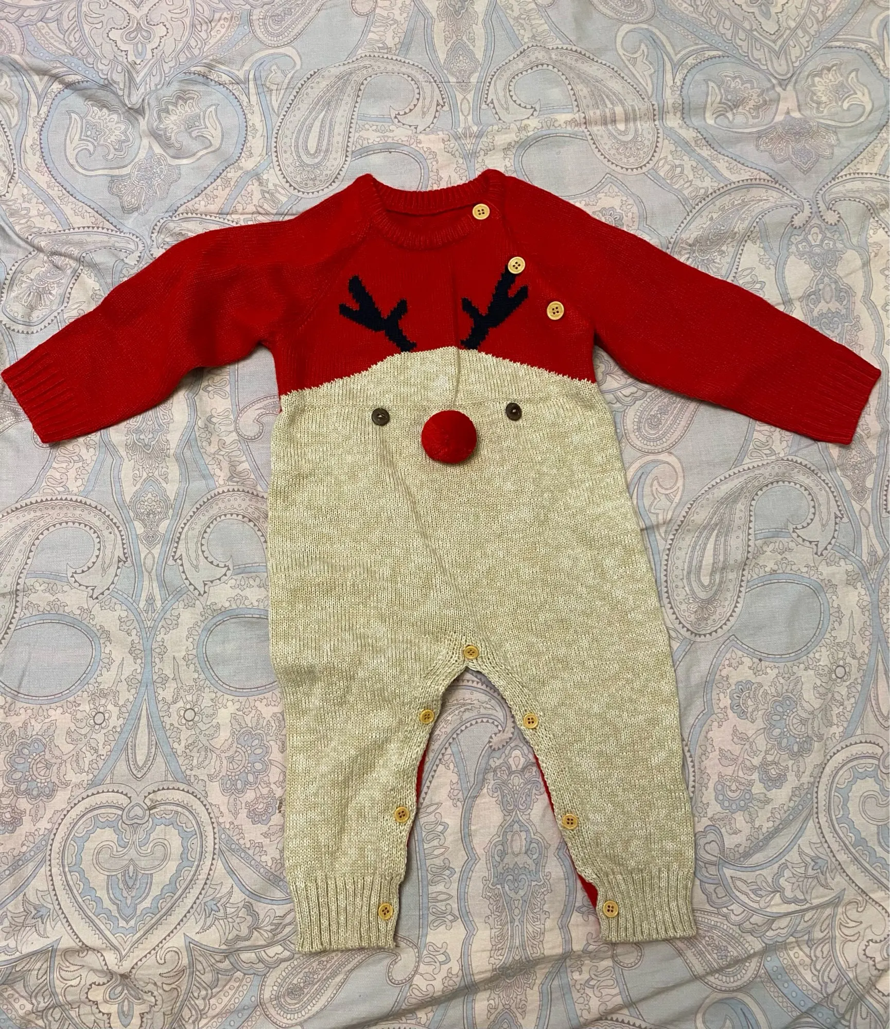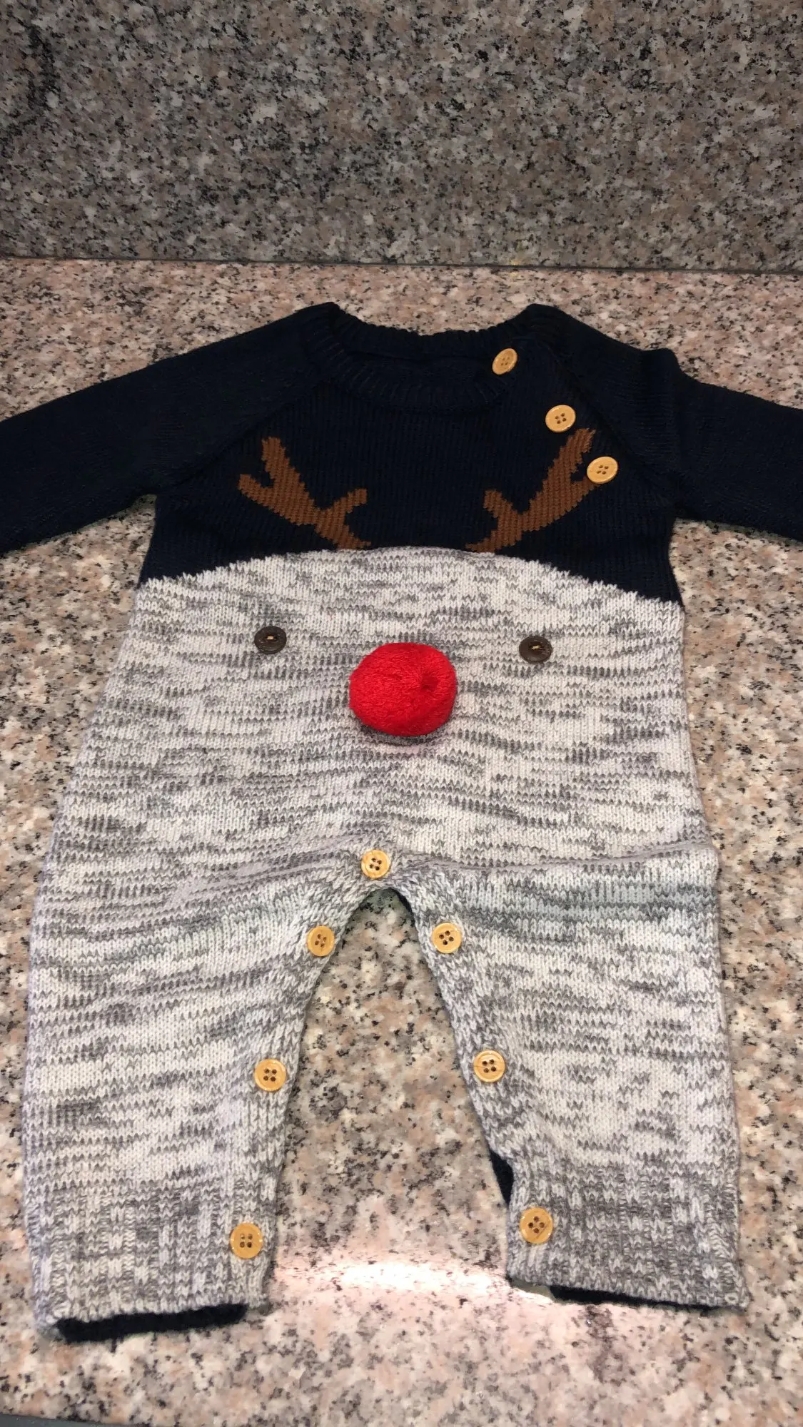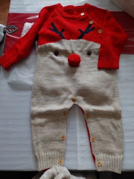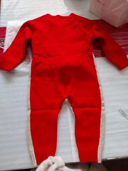 Прикольный костюмчик, мягкий, вязка плотная, но нам пришёл с небольшой дыркой под правой пуговицей (к сожалению её видно, что немного портит вид (а так всё прекрасно
