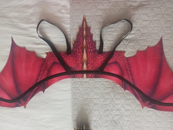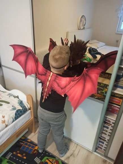 Маска плотная, но гибкая, приятная на ощупь. Резинка прикреплена болтиками. Крылья тоже прекрасны, на проволоке, поэтому Хорошо держат форму. Единственное, маска и крылья немного отличаются по цвету, разный тон зелёного. В целом рекомендую, ребёнок счастлив.