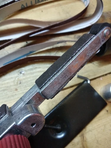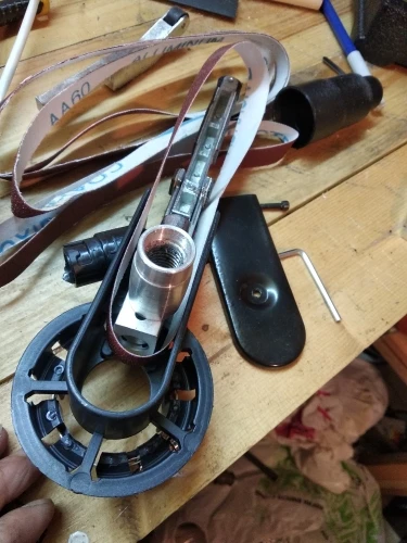 Игрушка работает. Болгарку конечно только с регулятором оборотов. Ролик люфтит поэтому лента сьезжает, с натяжением тоже подшаманить пришлось.