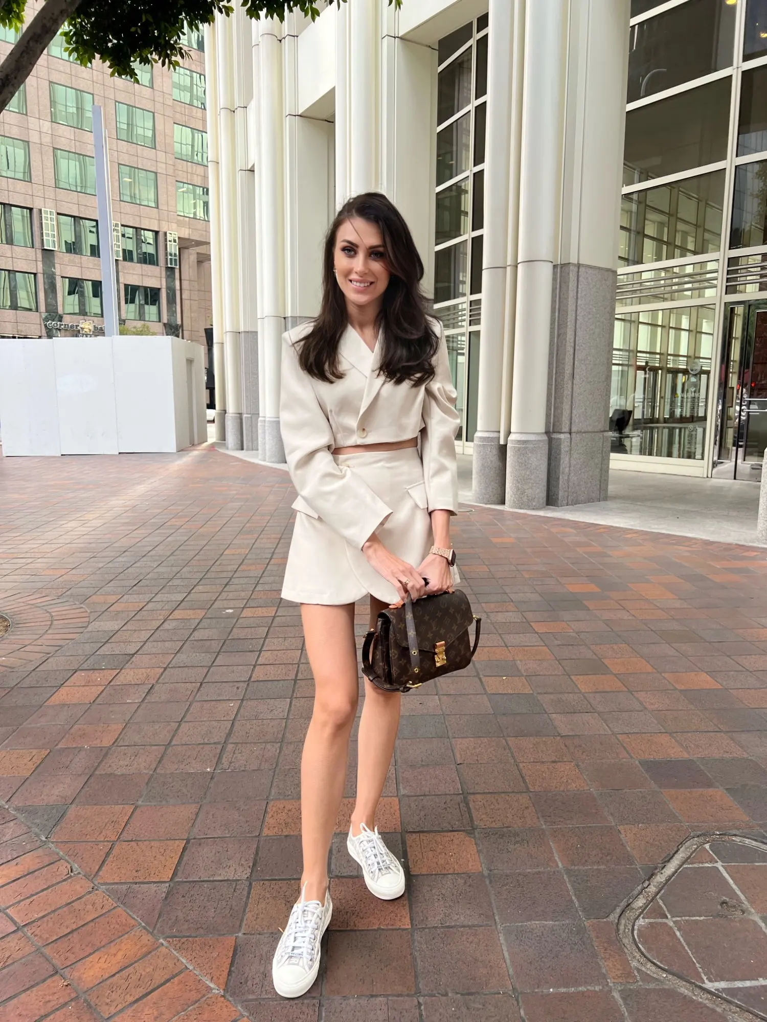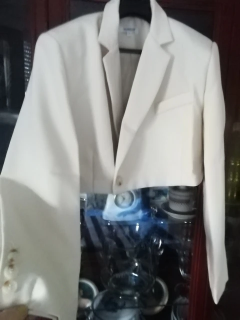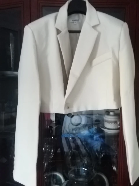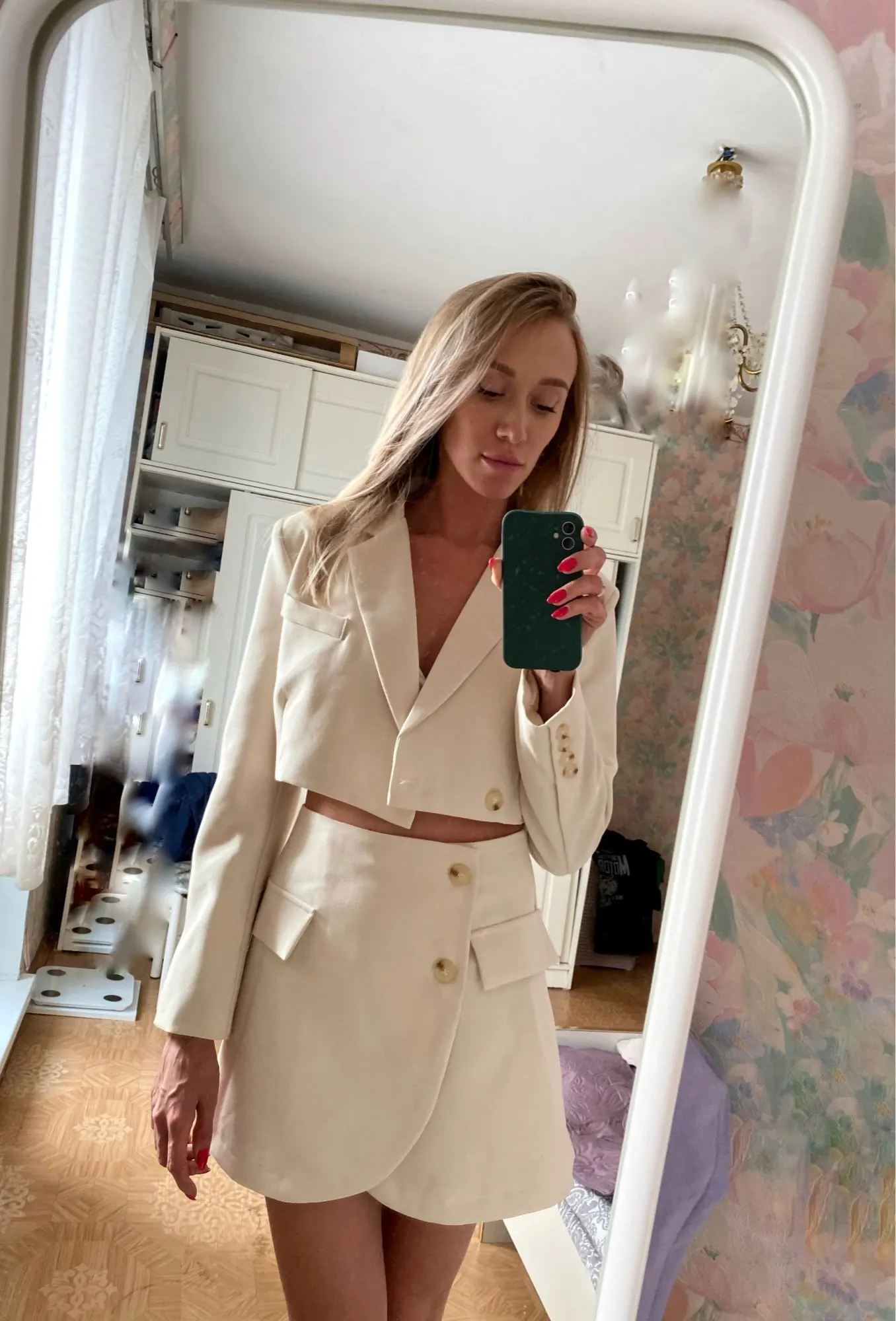 Модный женский костюм с коротким пиджаком на одной пуговице с длинными рукавами и асимметричной трапециевидной мини-юбкой с завышенной талией в стиле ретро