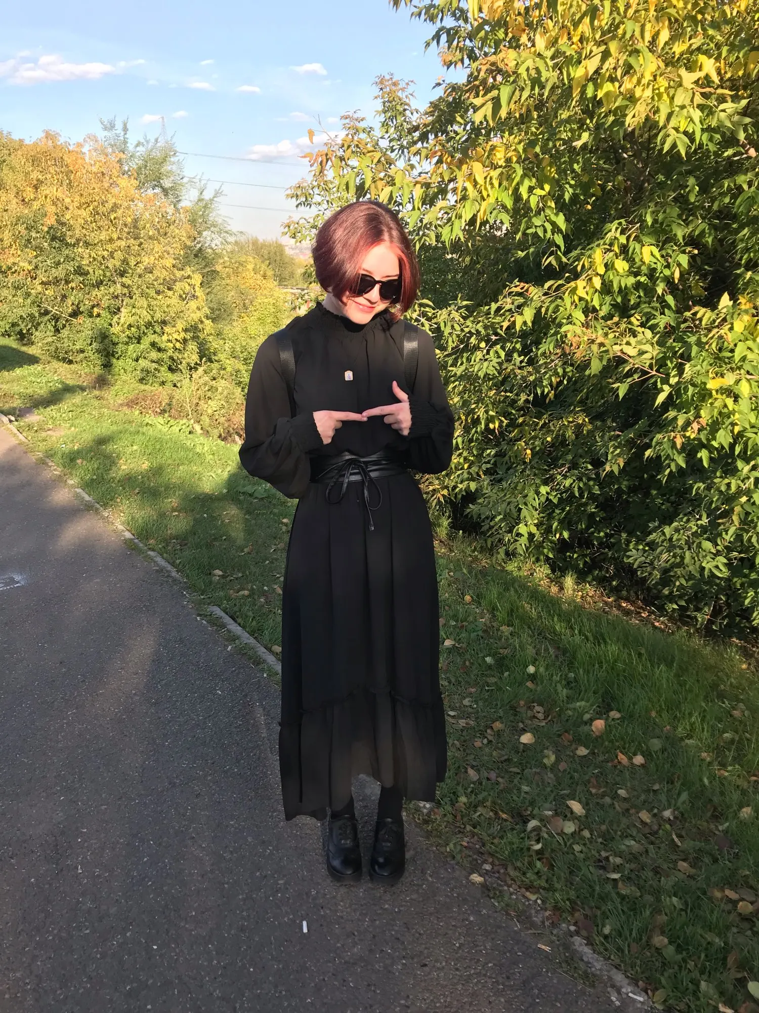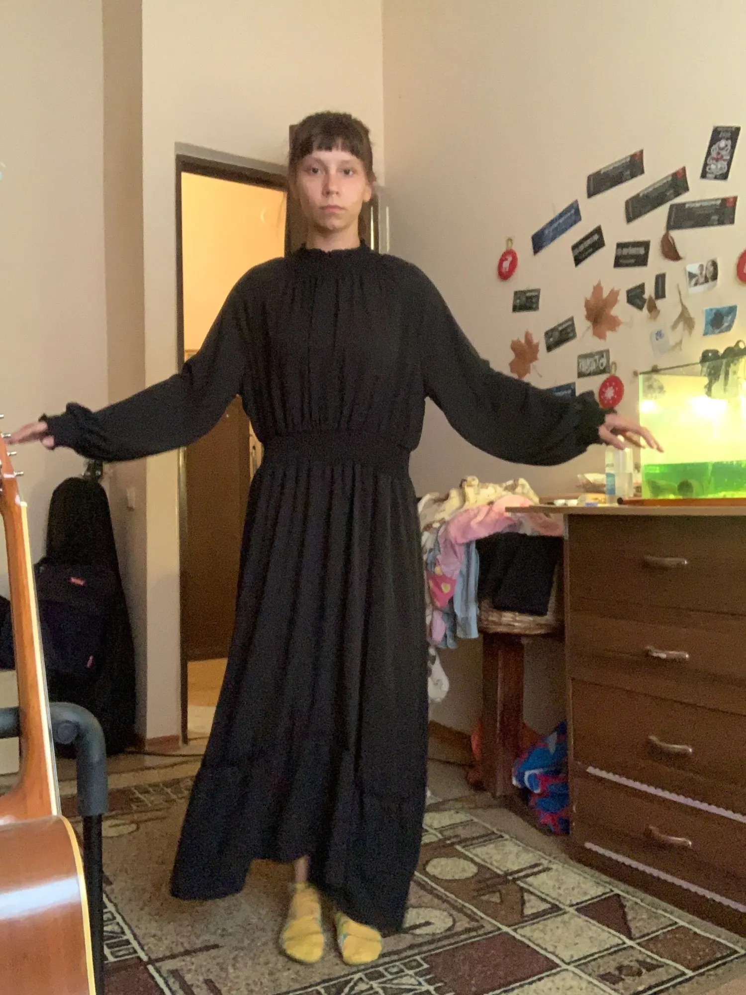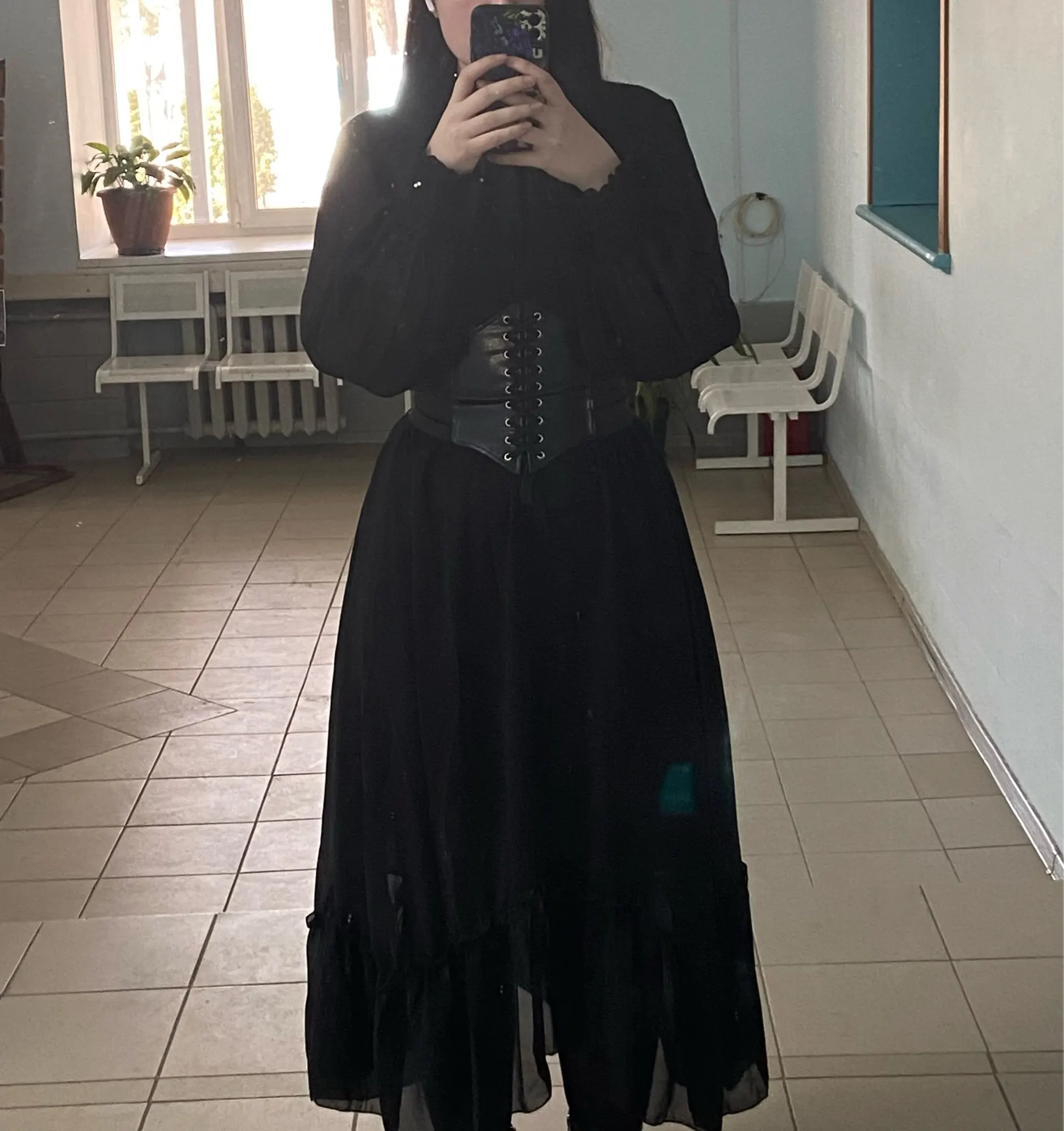 Модное женское черное платье с длинным рукавом и оборками, ТРАПЕЦИЕВИДНОЕ женское корейское цельнокроеное милое офисное весеннее платье макси для женщин