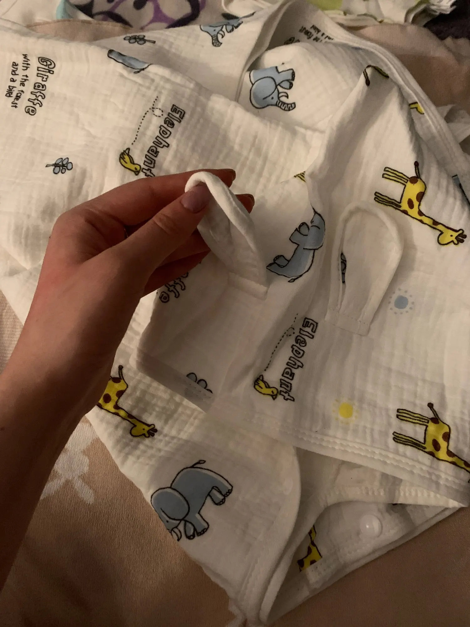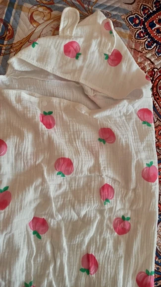 Супер-быстрая доставка: 12 дней в Израиль. Полотенца очень хорошие, мягкий муслин, капюшон большой, подойдет на голову малыша любого возраста (даже мне как раз). Само полотенце спереди застегивается на пластиковые кнопочки. Брала чтоб выносить малышей из ванны после купания ну и может на пляж буду брать