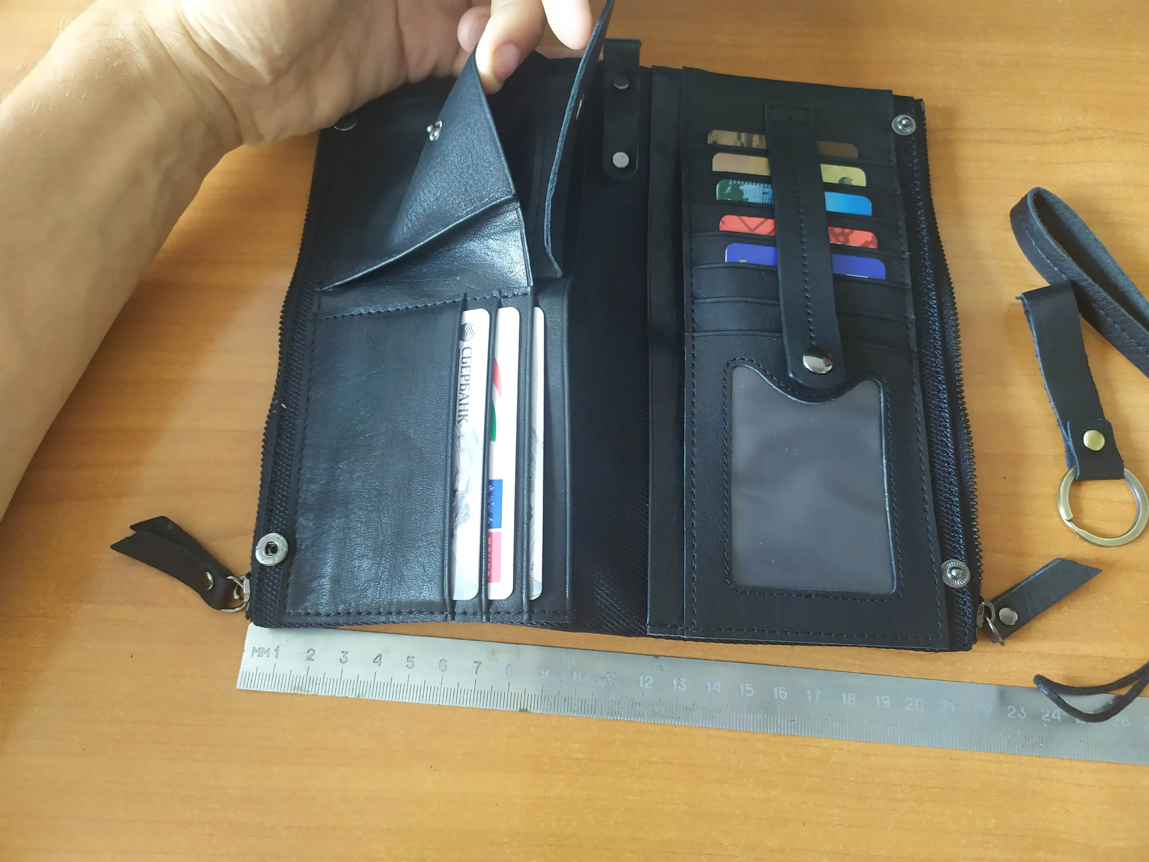 отправка очень быстрая. с описанием не совпадение лишь в цвете - коричневый в реальности более светлый, надо было брать черный. реально кожа, но выделка матовая. презентабельности минимум. кожа мягкая, тянется и облегает внутренности, но за счет этого поместилось всё: - паспорт, права, телефон, карты, монеты, деньги и даже осталось место под чеки покупок. едиственный недостаток - наручный ремешок цепляется непосредственно за кожаную петлю, а не за металлическое колечко. впоследствии петля сморщится, будет некрасиво, колечко придется натйти и сколхозить. а вообщем приобретением доволен. хотя согласился бы на более презентабельную отделку кожи за большую цену. но за счет крайнего удобства в использовании, рекомендую.