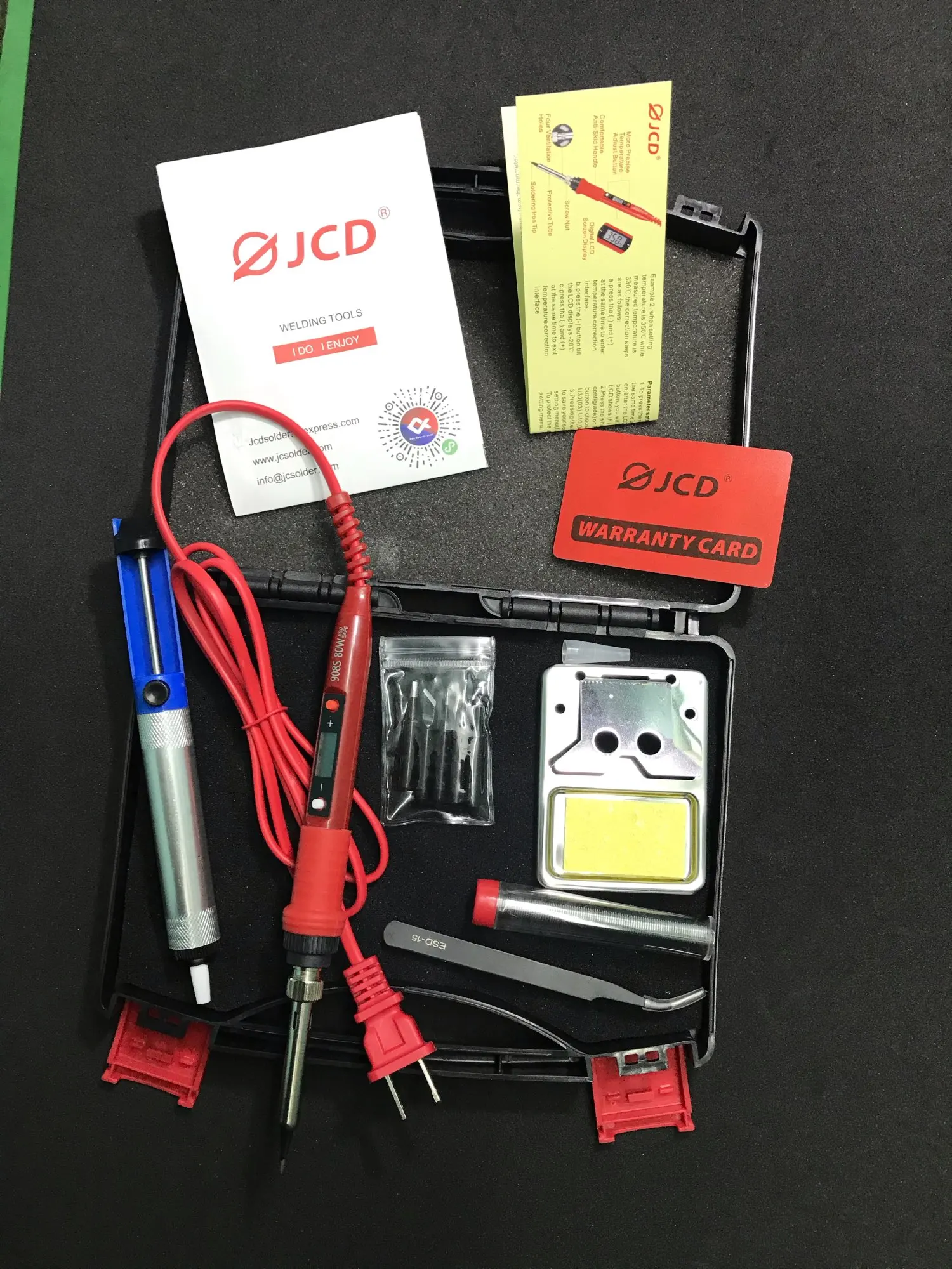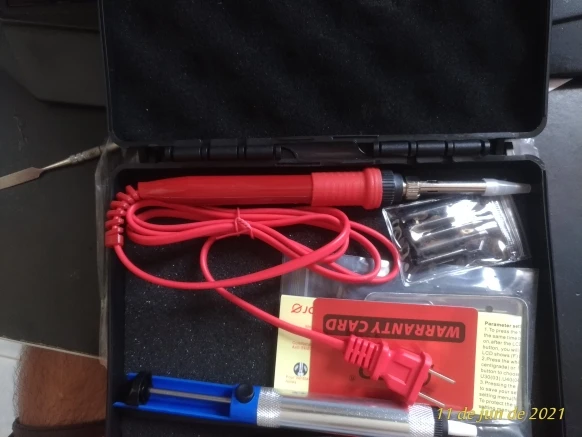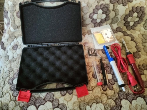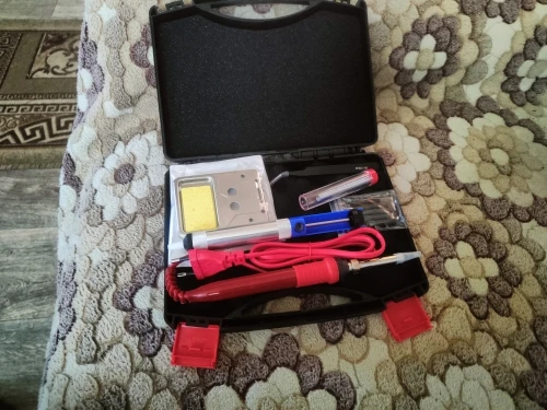 Все соответствует заявленной комплектации. Удобно сложено в пластиковый кейс. Паяльник нагревается быстро, регулировка температуры работает. Очень мягкий провод, паяльник небольшой, легкий, держать его очень удобно. Оптимальный набор аксессуаров. В комплекте есть инструкция на английском языке. Все замечательно!