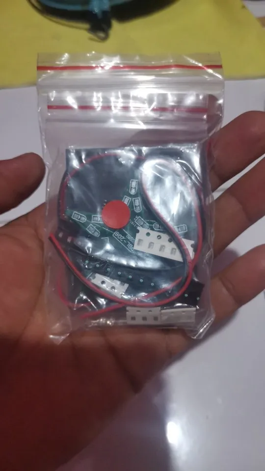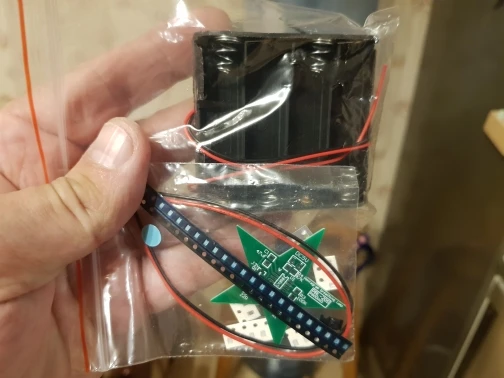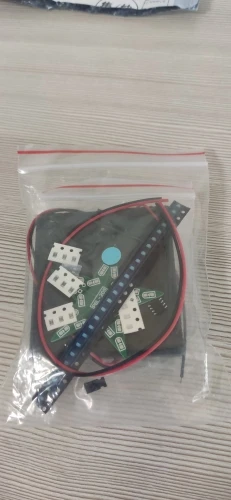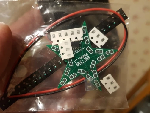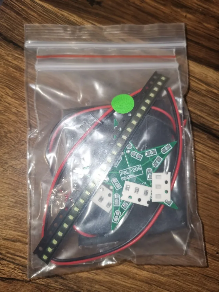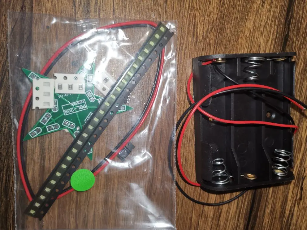 Доставка заняла 15 дней до Волгограда. Заказывал два комплекта, красного цвета. Мелкие детали (smd) и плата в отдельном пакетике с замком. Инструкцию в комплект не входит! На плате элементы подписаны. Светодиоды, конденсатор и резисторы идут с запасом (светодиоды smd0805 красного цвета - 25 шт.; резистор (smd0805): 22 Ом - 3 шт., 33 кОм - 3 шт., 47 кОм - 3 шт., 100 кОм - 3 шт.; конденсатор - 2 шт.. Микросхема (LM358) - 1 шт.; транзистор - 1 шт.; батарейный отсек и два провода. Ожидал немного больших размеров звезды. Разгорается и плавно затухает, цикл повторяется пока приложено питание.