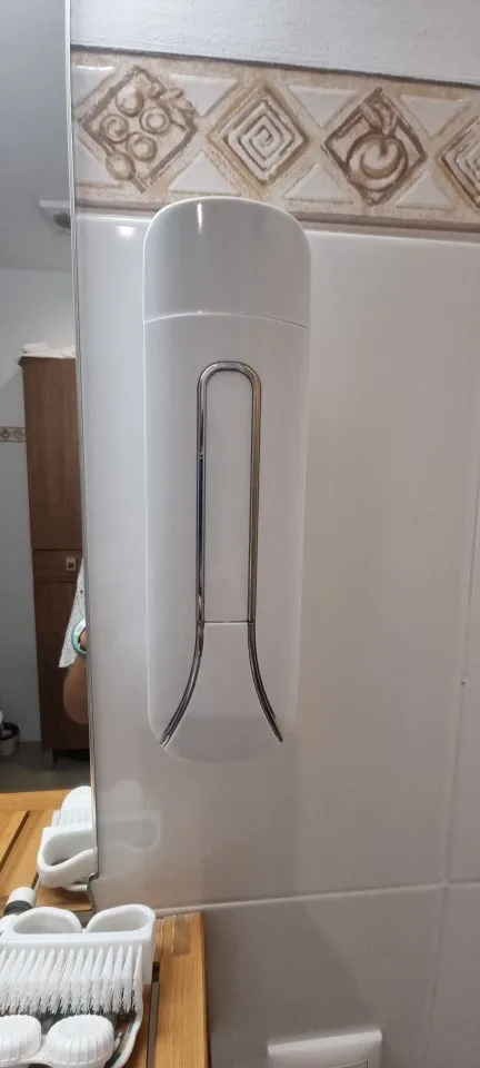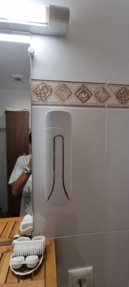 По своей невнимательности не обратила внимания на то, что диспенсеры КРЕПЯТСЯ К СТЕНЕ БОЛТАМИ (саморезами, не суть), а мне принципиально было не сверлить керамогранит. Купила влагостойкий прозрачный 2сторонный скотч в Fixprice и приклеила на него. Всё хорошо держится.