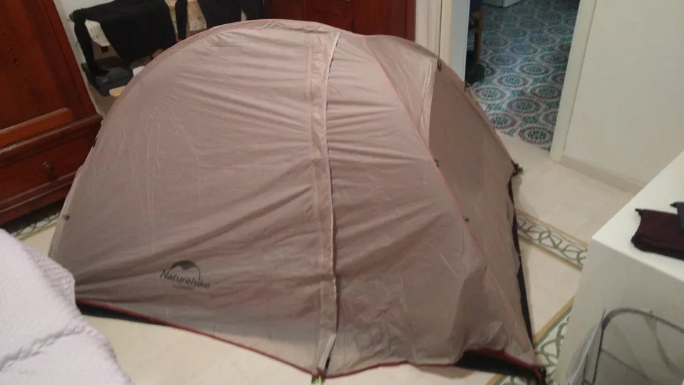 Отличная, компактная палатка. Легко собирается, хорошо собрана. Швы проклеены. Пара ниток торчали изнутри палатки, но не критично. Тент натянуть по-человечески в домашних условиях не удалось, но думаю с ним тоже нет проблем. Покупкой доволен. Доставка в Москву за 8 дней до пункта выдачи.