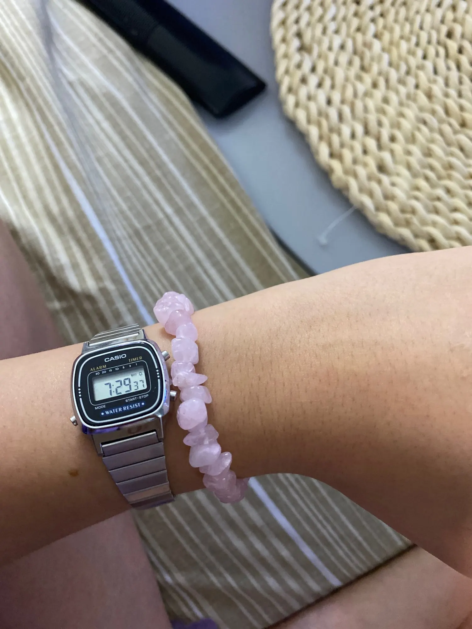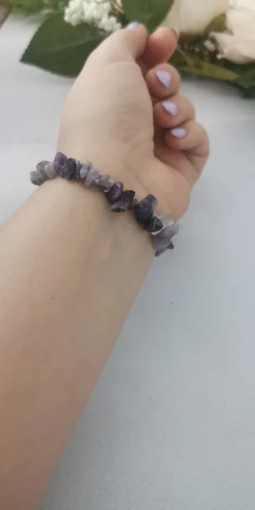 Натуральный камень, но почти белый, розовым совсем чуть-чуть отдаёт, а так камушки ровные, чистенькие, браслет красивый.