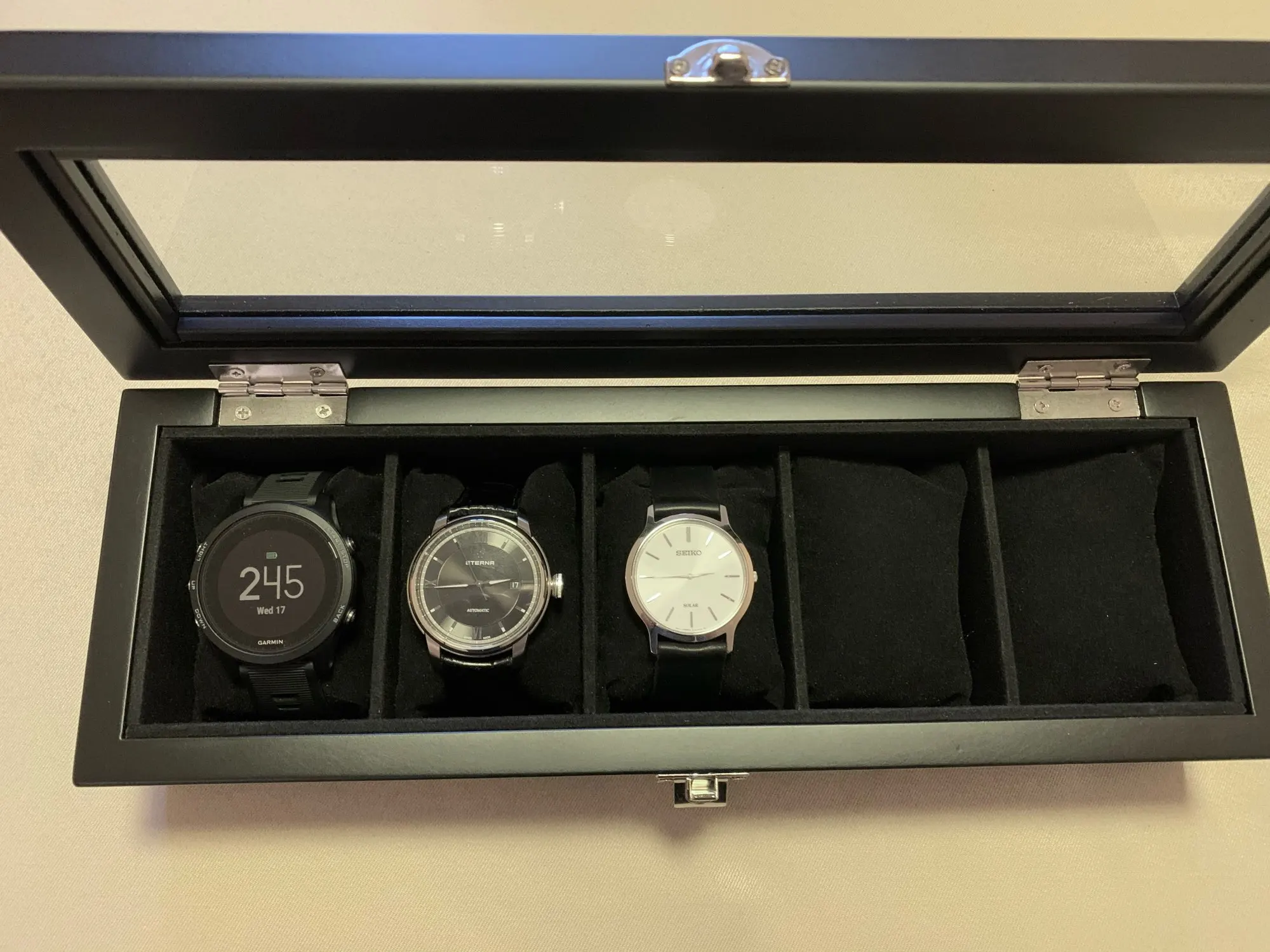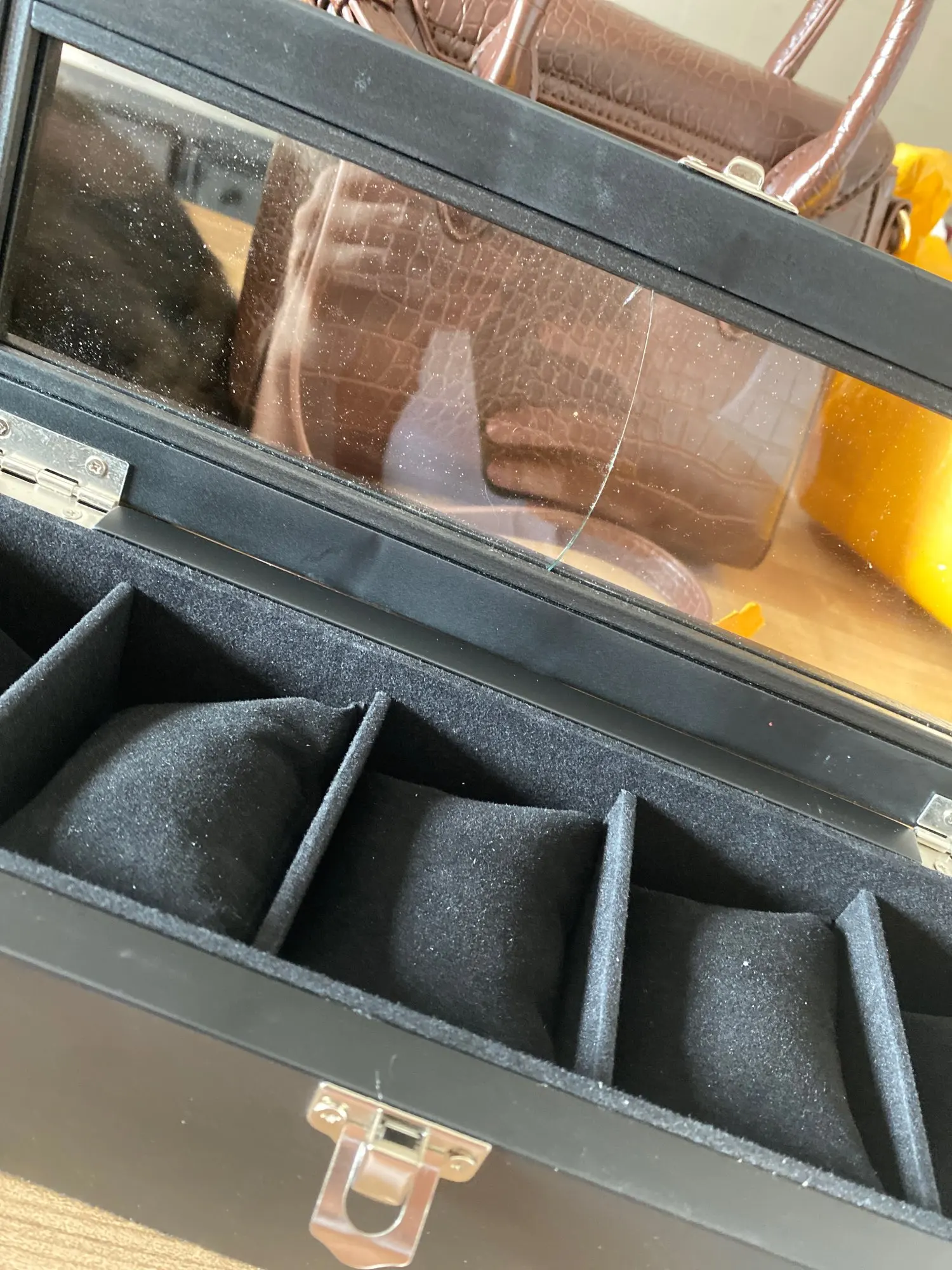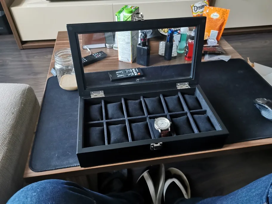 Хорошая крепкая коробка, 6 дней до Москвы (1.9кг). Стекло настоящее, рамка и петли немного хлипкие, но за эти деньги лучше я ничего не нашел. Снизу мягкий велюр, запаха клея и пластика нет.