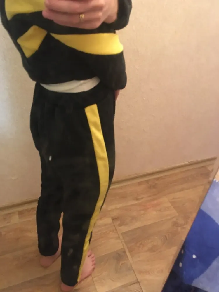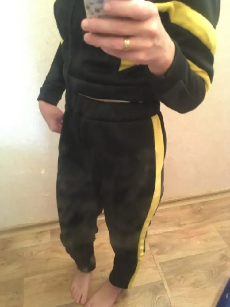 Мне ужасно не понравидся этот костюм. Ткань неприятная. Сразу жарко. Резинка на штанах ужасно не красивая. Ткань собирается, не облегает тело, а висит как мешок от талии. И самое ужасное, что это невозможно скрыть. Кофта -то короткая. Я не буду носить этот костюм. Выкинула деньги на ветер. Не стоит своих денег.
