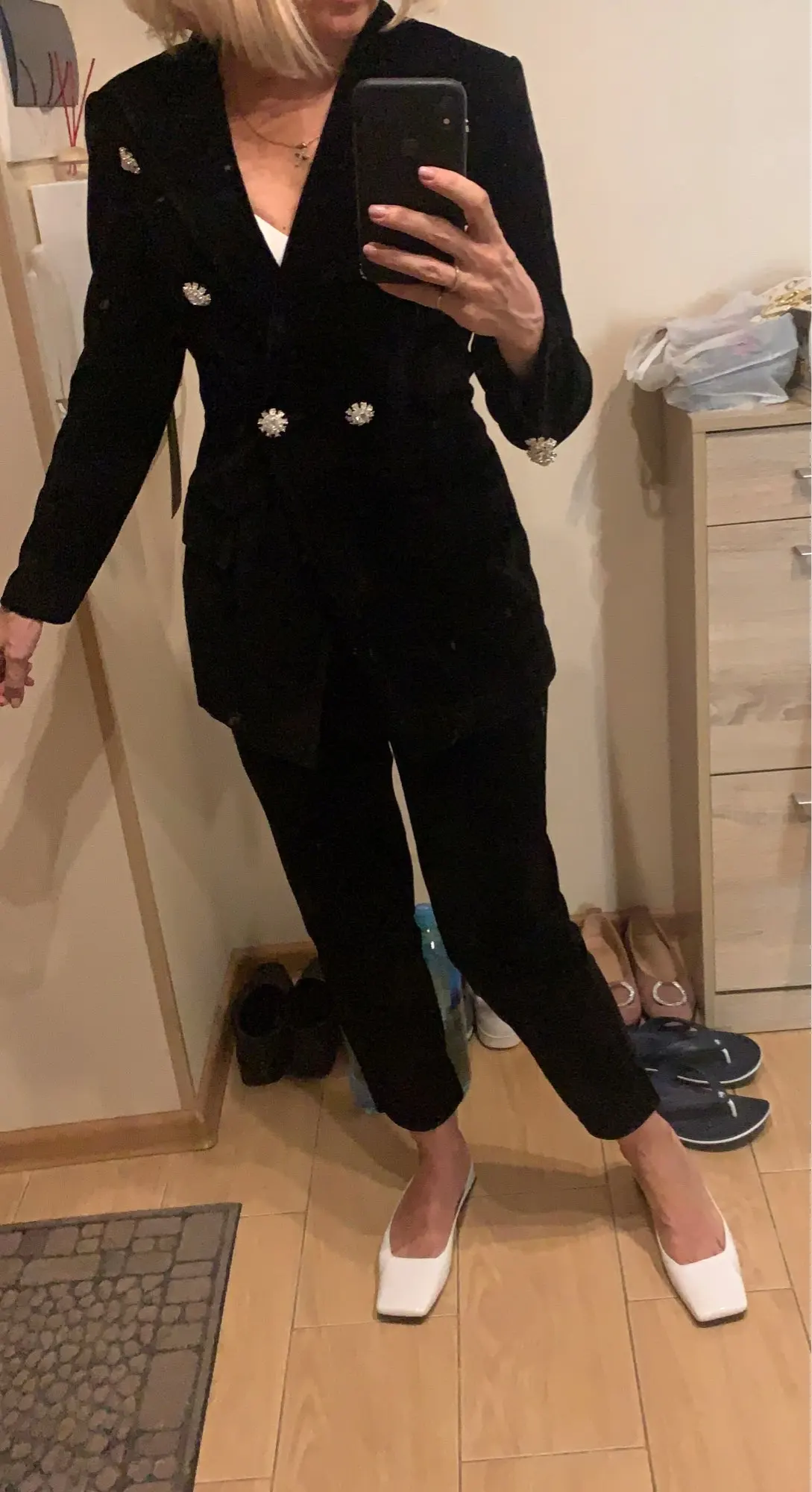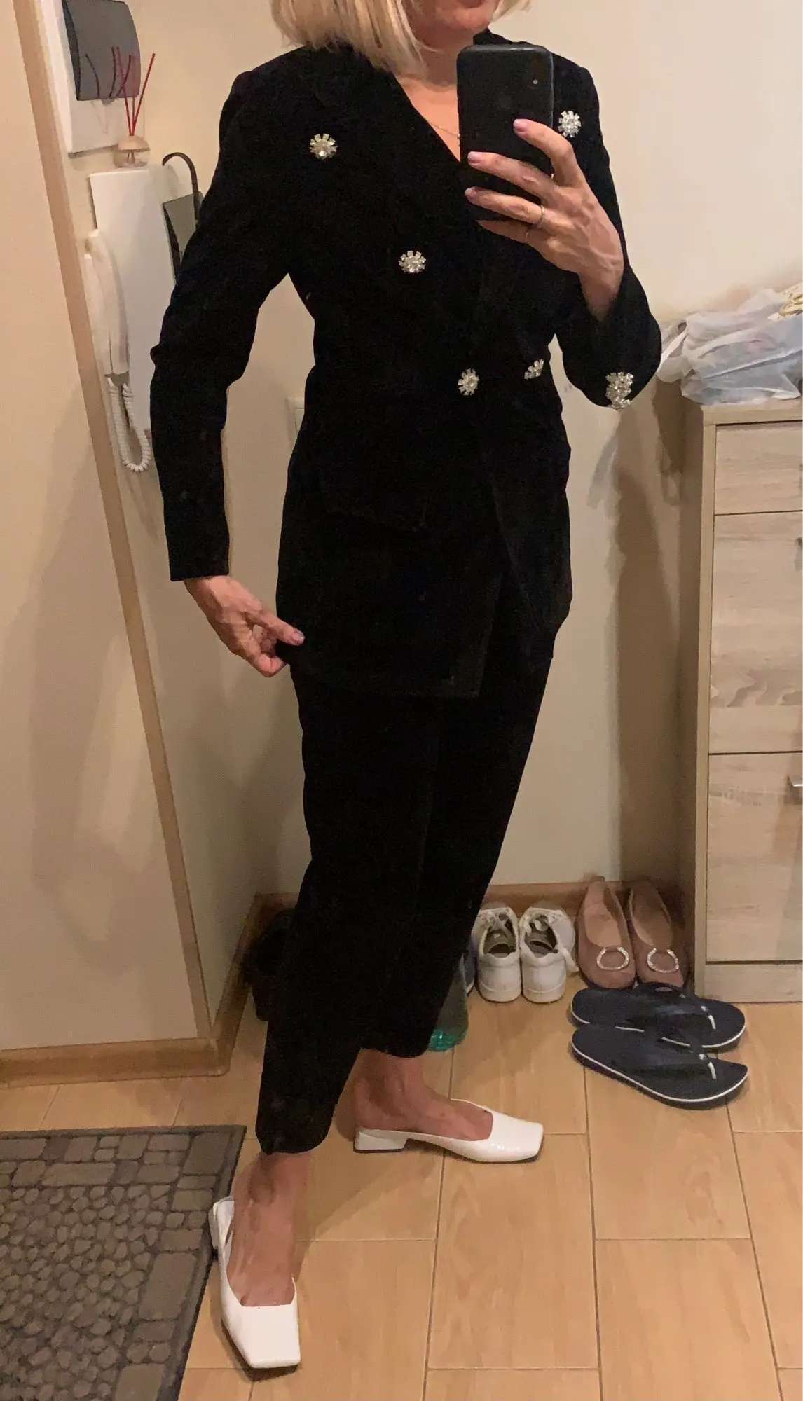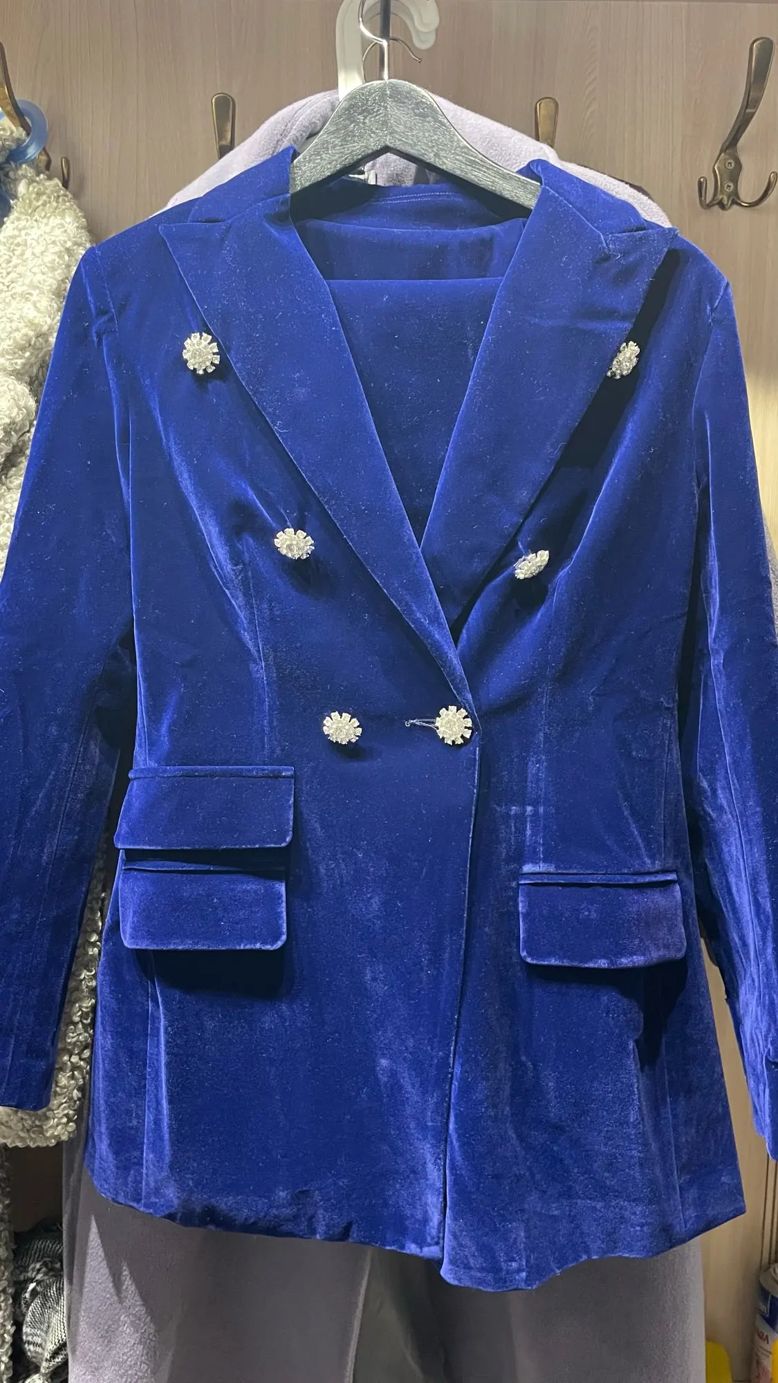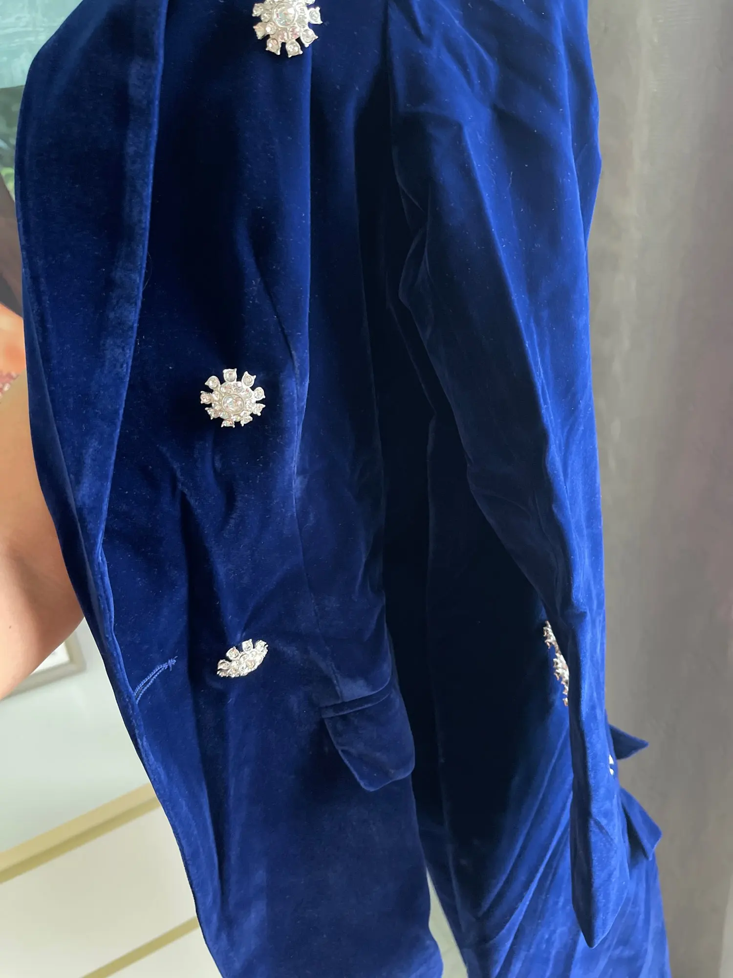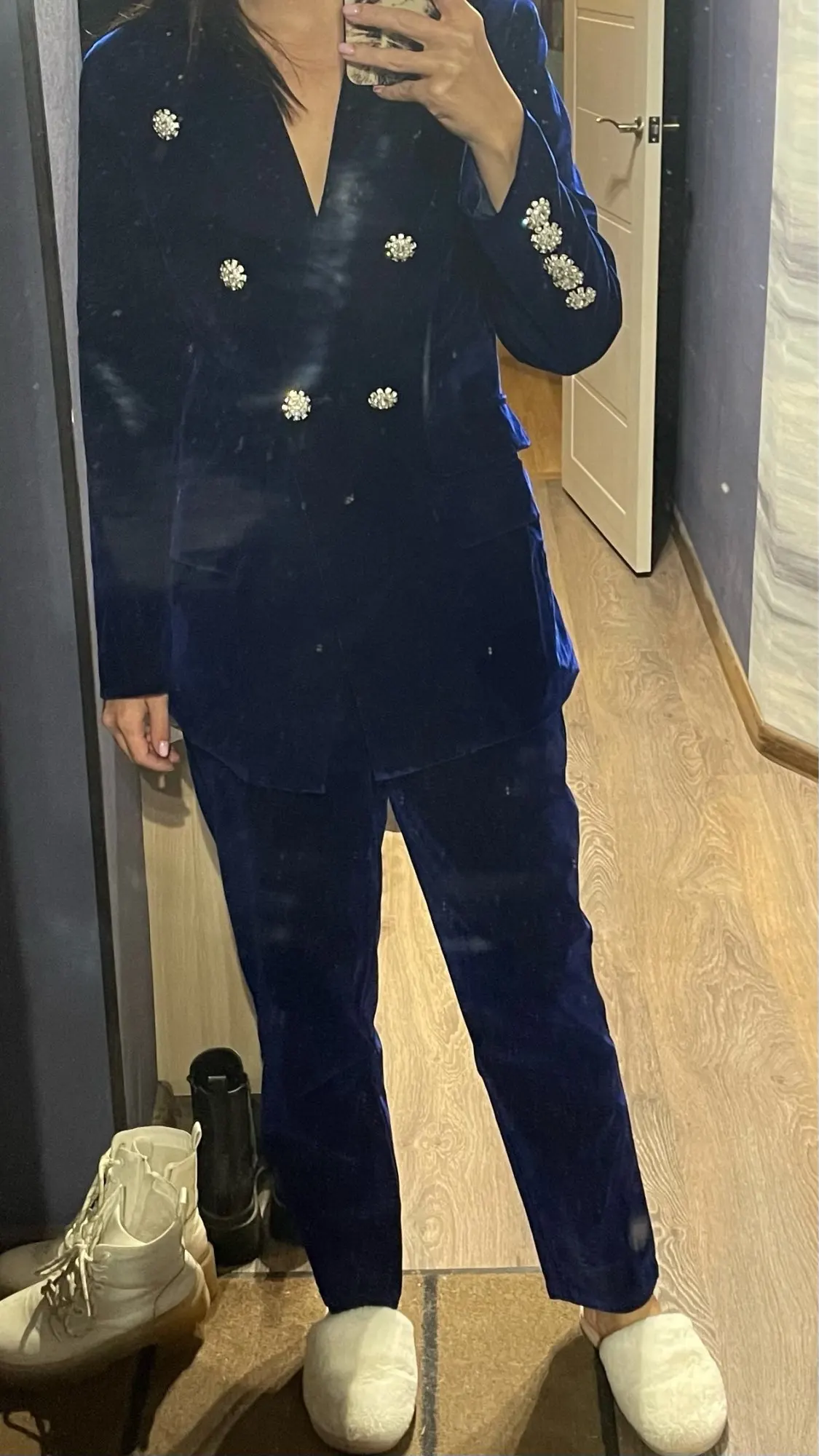 Костюм шикарный, ткань плотная. Немного торчат нитки и при примерке отлетели 4 пуговицы, держаться на соплях, пришлось пришивать чтоб не отпали но в целом костюм достойный как для алиэкспресс)))